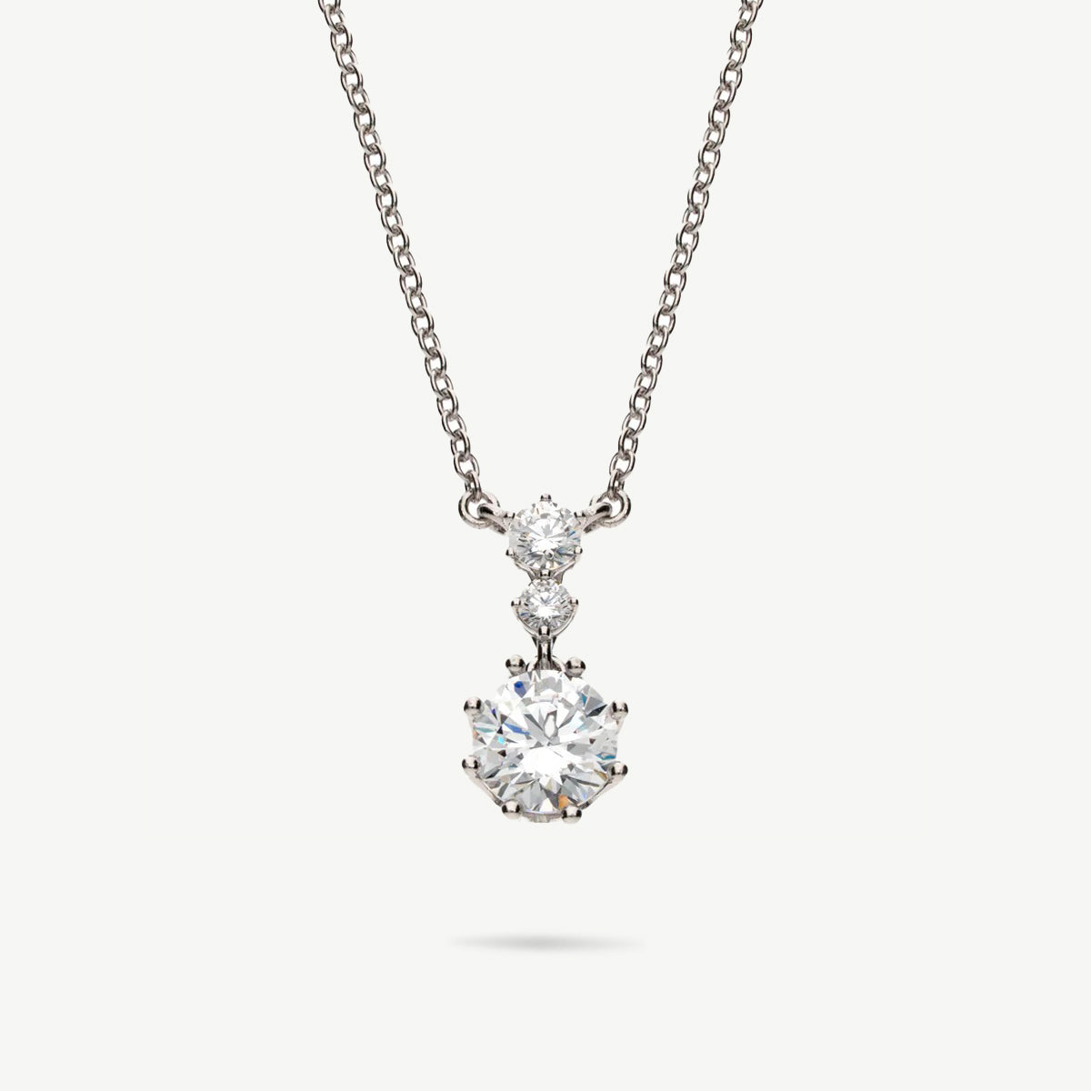 La collana Fabiani in argento 925 rodiato incarna l’eleganza senza tempo del classico design trilogy, con tre zirconi bianchi taglio brillante disposti in verticale per esaltare la luce e la purezza delle pietre.