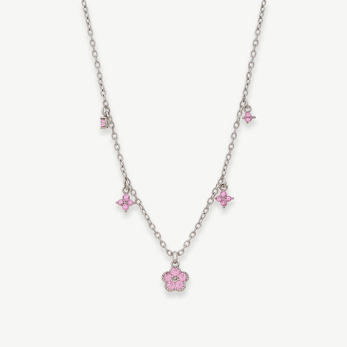 Una collana in argento con fiore e zirconi rosa che unisce romanticismo e raffinatezza, ideale per completare ogni look con eleganza discreta.
