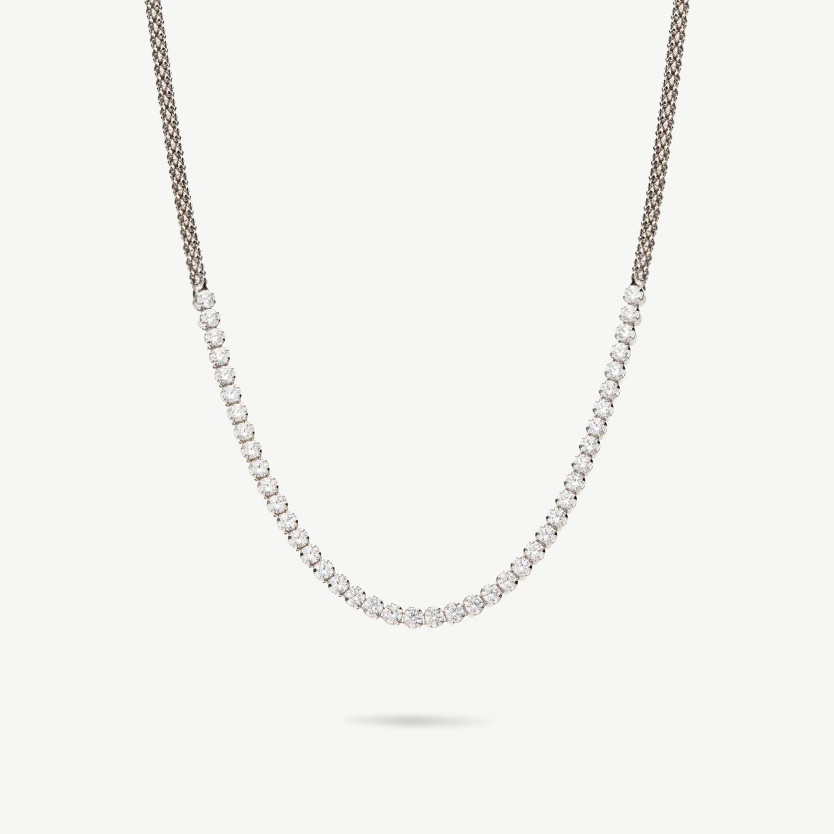 Eleganza e raffinatezza si incontrano in questa collana tennis da donna in argento 925 rodiato, impreziosita da una linea continua di zirconi bianchi taglio brillante. Il design sofisticato è valorizzato da una maglia tubolare a trama fitta, che dona solidità e stile contemporaneo al gioiello.