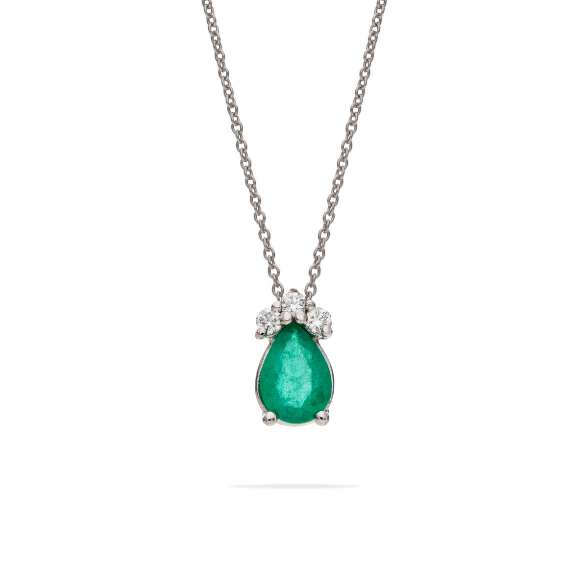 Questa collana in oro bianco 18Kt è un gioiello raffinato ed elegante che esalta la bellezza senza tempo delle pietre preziose. Il protagonista è uno smeraldo naturale da 0.50 carati taglio goccia, dal colore verde intenso e brillante. A valorizzarlo ulteriormente, tre diamanti naturali dal taglio brillante per un totale di 0.06 carati, incastonati sopra la pietra centrale per un delicato effetto luminoso.