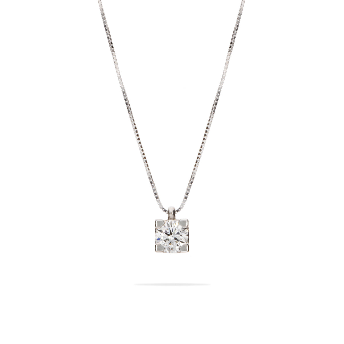 Brilla con la luce pura di questa collana punto luce in oro bianco 18kt, impreziosita da un diamante naturale taglio brillante da 0,40 carati