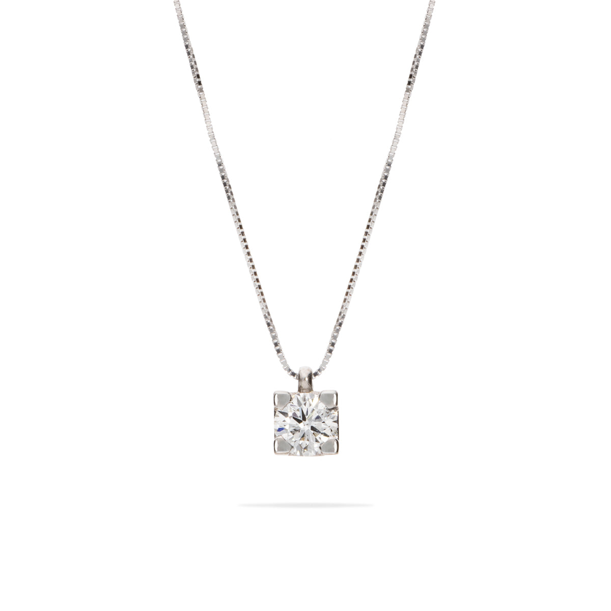 Brilla con la luce pura di questa collana punto luce in oro bianco 18kt, impreziosita da un diamante naturale taglio brillante da 0,50 carati  con certificato IGI Colore F, Purezza SI 2.