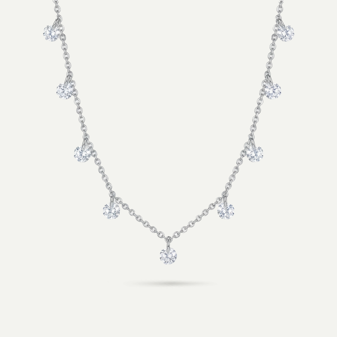 I pendenti, disposti in modo armonioso lungo la catena, creano un effetto luminoso leggero e dinamico che illumina il look senza risultare eccessivo. Un gioiello femminile e versatile, ideale sia per l’uso quotidiano che per occasioni speciali.