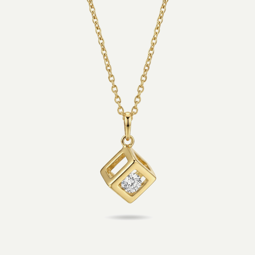 Elegante e luminosa, questa collana Fabiani in argento 925 è caratterizzata da un raffinato pendente a cubo in oro giallo 9 carati, impreziosito da un zircone bianco brillante incastonato su una delle facce. Il design geometrico e pulito rende il gioiello moderno e sofisticato, perfetto per chi ama dettagli essenziali ma di grande effetto.