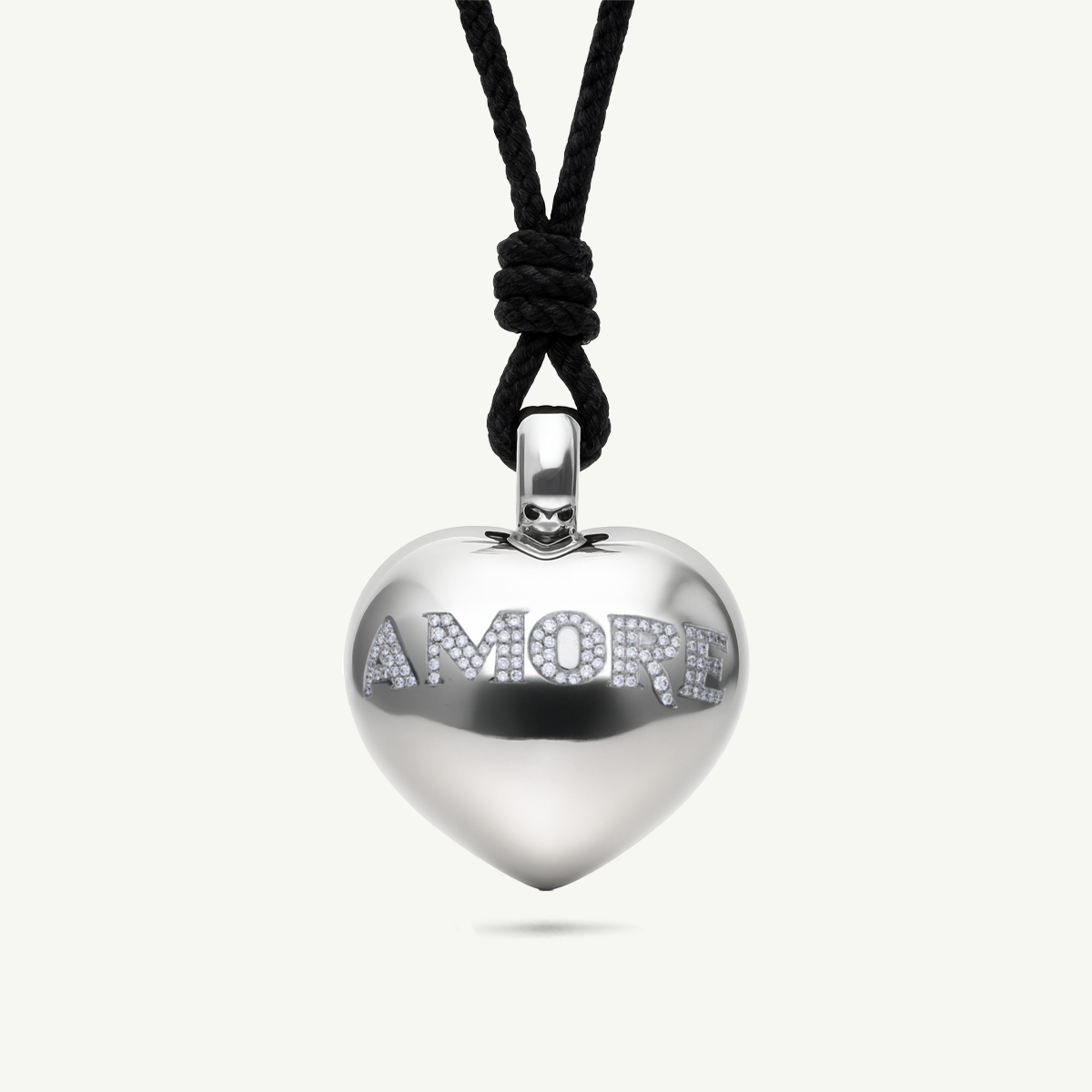 La Collana Amore di Pasquale Bruni unisce design contemporaneo ed eleganza senza tempo. Il pendente a cuore in oro bianco 18Kt è impreziosito dalla scritta AMORE realizzata in pavé di diamanti bianchi, che illumina il gioiello con una brillantezza sofisticata e riconoscibile.