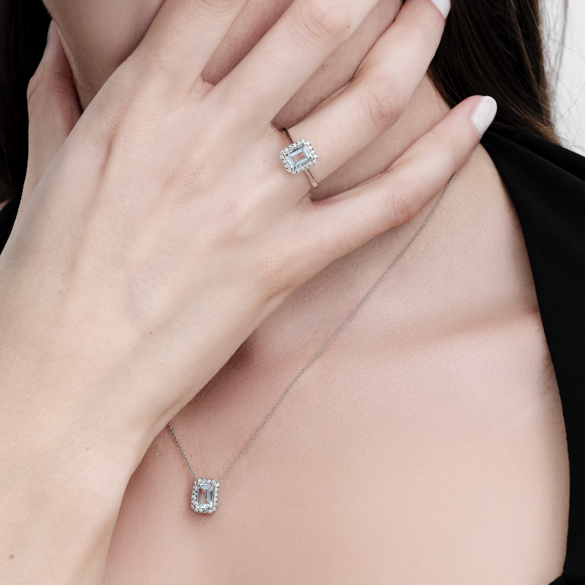 Girocollo in oro bianco 18 Kt con acquamarina di 0,70 Ct e diamanti taglio brillante baguette per complessivi 0,12 Ct