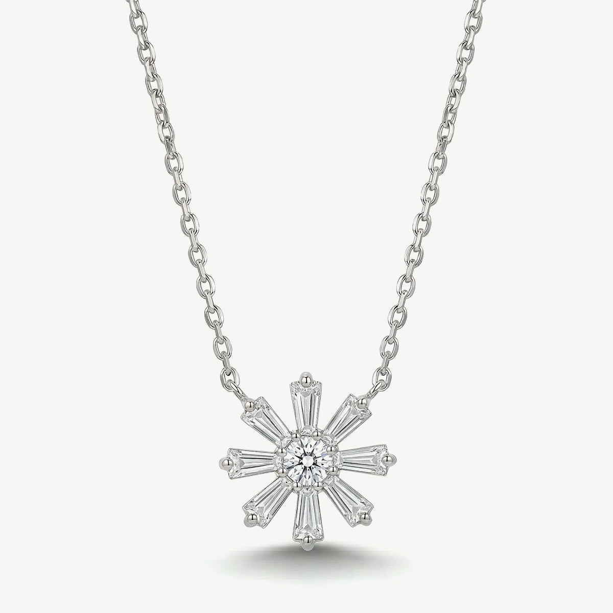 Il pendente presenta un elegante fiore impreziosito da uno zircone bianco centrale taglio brillante, capace di riflettere la luce con grande luminosità. Attorno alla pietra centrale si sviluppano zirconi bianchi disposti a raggiera, che creano un raffinato effetto floreale dal forte impatto visivo e dal design moderno e femminile.