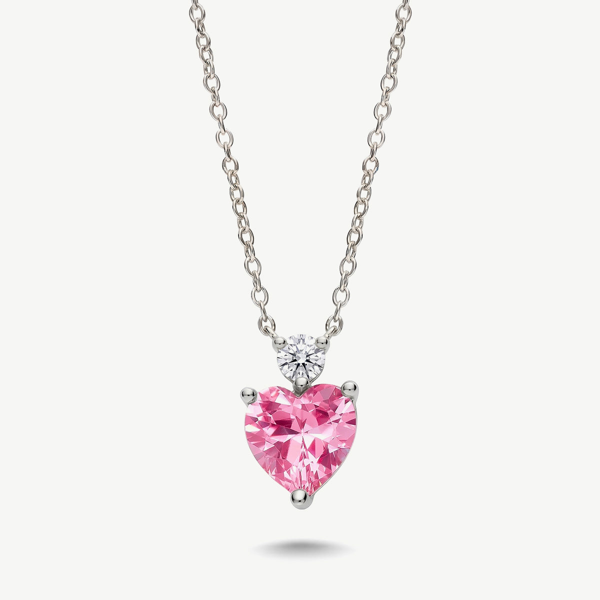 Il pendente è composto da un raffinato zircone rosa taglio cuore, incastonato con montatura a griffe e dal diametro di circa 0,6 cm, che dona al gioiello un tocco romantico e luminoso. Sopra il cuore è presente un zircone bianco taglio brillante, anch’esso con montatura a griffe e diametro di circa 0,3 cm, che completa il design aggiungendo ulteriore brillantezza.