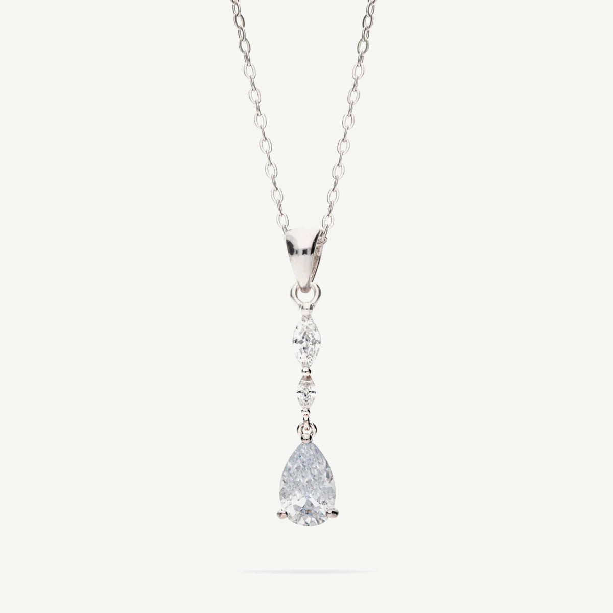 Il ciondolo è composto da uno zircone bianco taglio goccia dal diametro di circa 0,7 cm, montato con cura per esaltarne la profondità e l’intensità del colore. Nella parte superiore, a sorreggere la pietra centrale, sono presenti due piccoli zirconi bianchi di diverse dimensioni, che aggiungono luce e creano un elegante effetto degradé.