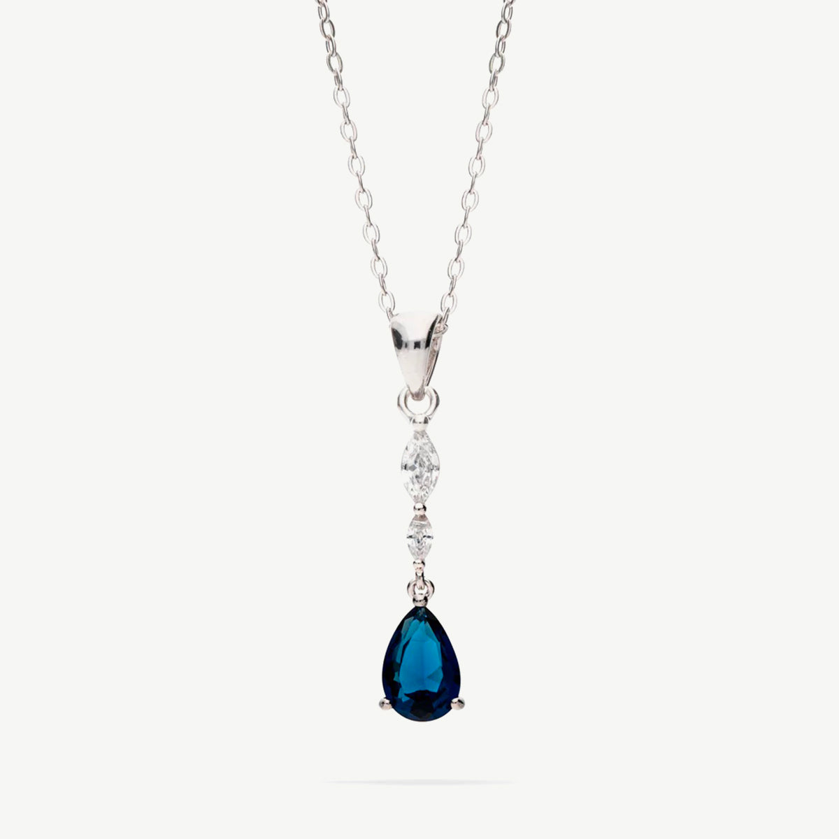 Il ciondolo è composto da uno zircone blu taglio goccia dal diametro di circa 0,7 cm, montato con cura per esaltarne la profondità e l’intensità del colore. Nella parte superiore, a sorreggere la pietra centrale, sono presenti due piccoli zirconi bianchi di diverse dimensioni, che aggiungono luce e creano un elegante effetto degradé.