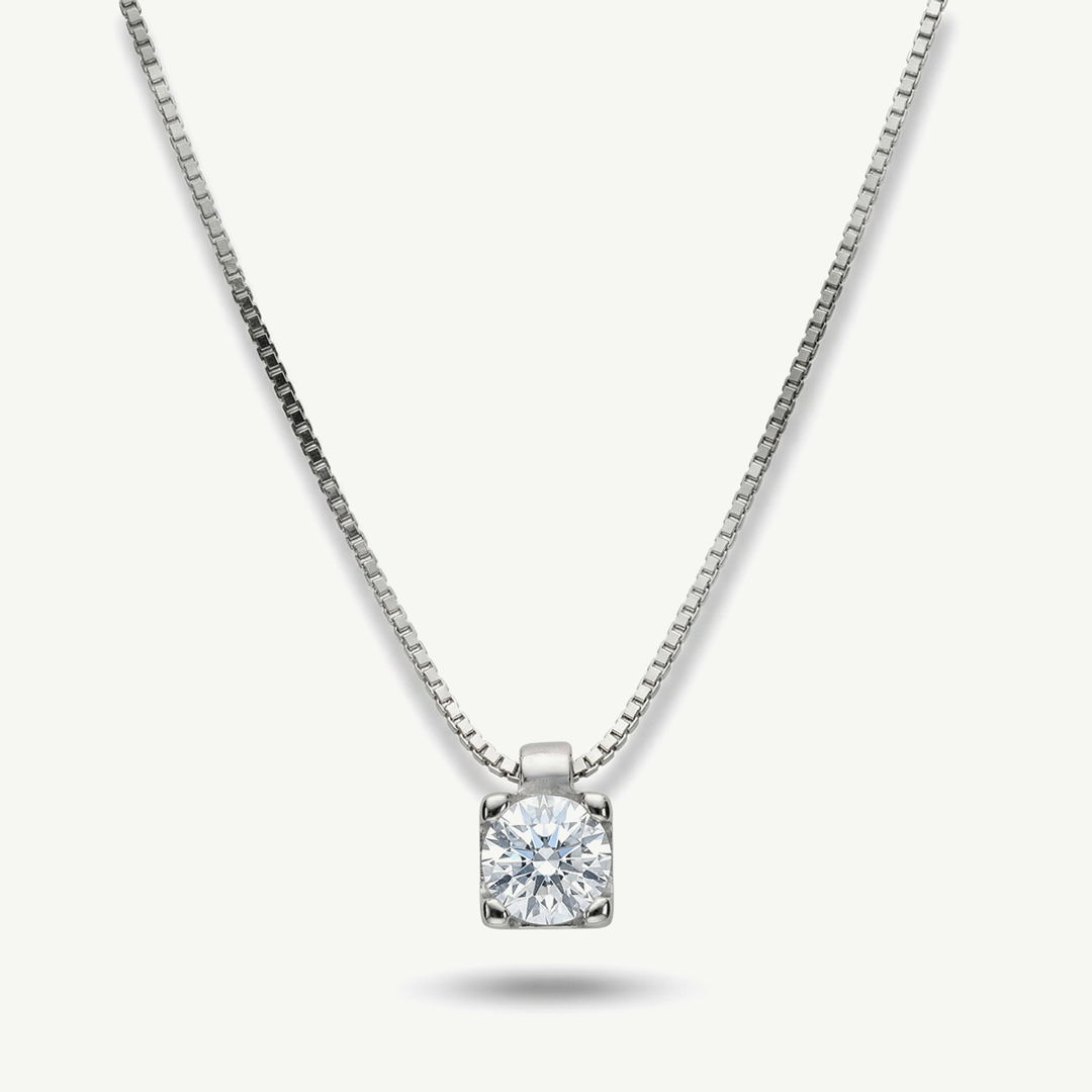 La Collana Fabiani Punto Luce in Oro Bianco 9Kt è un gioiello essenziale e raffinato, perfetto per chi ama la luminosità discreta dei grandi classici. Realizzata in oro bianco 9Kt, è impreziosita da uno zircone bianco taglio brillante da circa 4 mm, valorizzato da una elegante montatura a 4 griffe che permette alla luce di attraversare la pietra, esaltandone brillantezza e purezza.