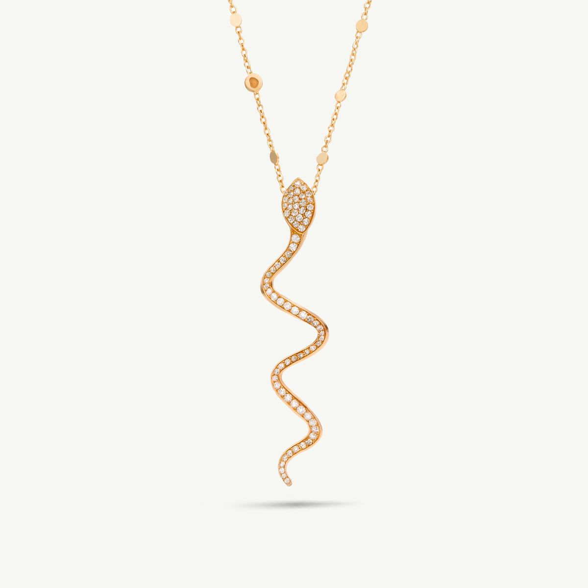 La Collana Serpente Pasquale Bruni è un gioiello di forte personalità, realizzato in oro rosa 18 kt e arricchito da diamanti bianchi che illuminano le curve sinuose del pendente. Il protagonista è il raffinato serpente, simbolo di trasformazione, rinascita e femminilità, lungo circa 7 cm.