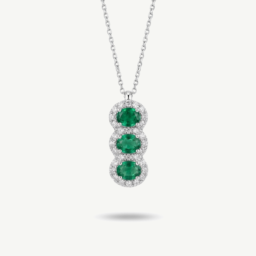 Il design trilogy rappresenta un simbolo profondo di continuità e legame, mentre la classica montatura a margherita esalta la brillantezza dei diamanti e la profondità cromatica degli smeraldi. L’oro bianco, luminoso e moderno, crea un perfetto equilibrio tra luce e colore, rendendo il pendente elegante ma mai eccessivo.