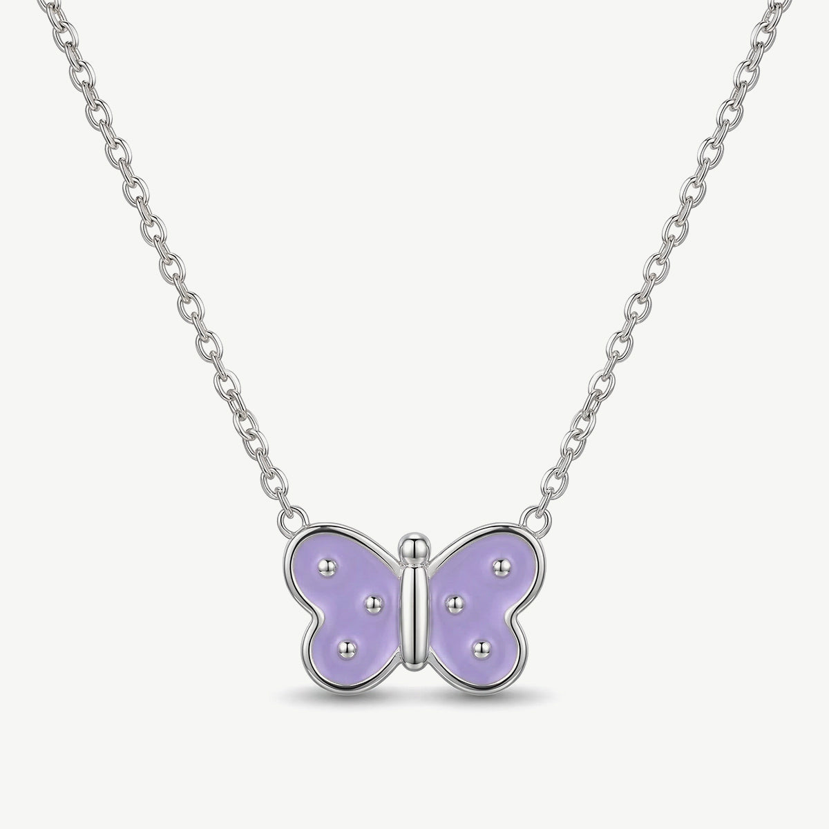 Il punto centrale della collana è una farfalla smaltata di colore lilla, simbolo di leggerezza, trasformazione e libertà. Il contrasto tra la brillantezza dell’argento e lo smalto lilla rende il gioiello fresco e luminoso, ideale da indossare tutti i giorni oppure per completare un outfit più elegante.