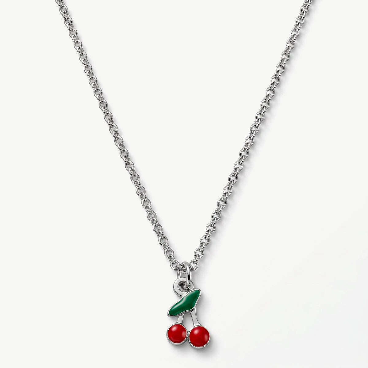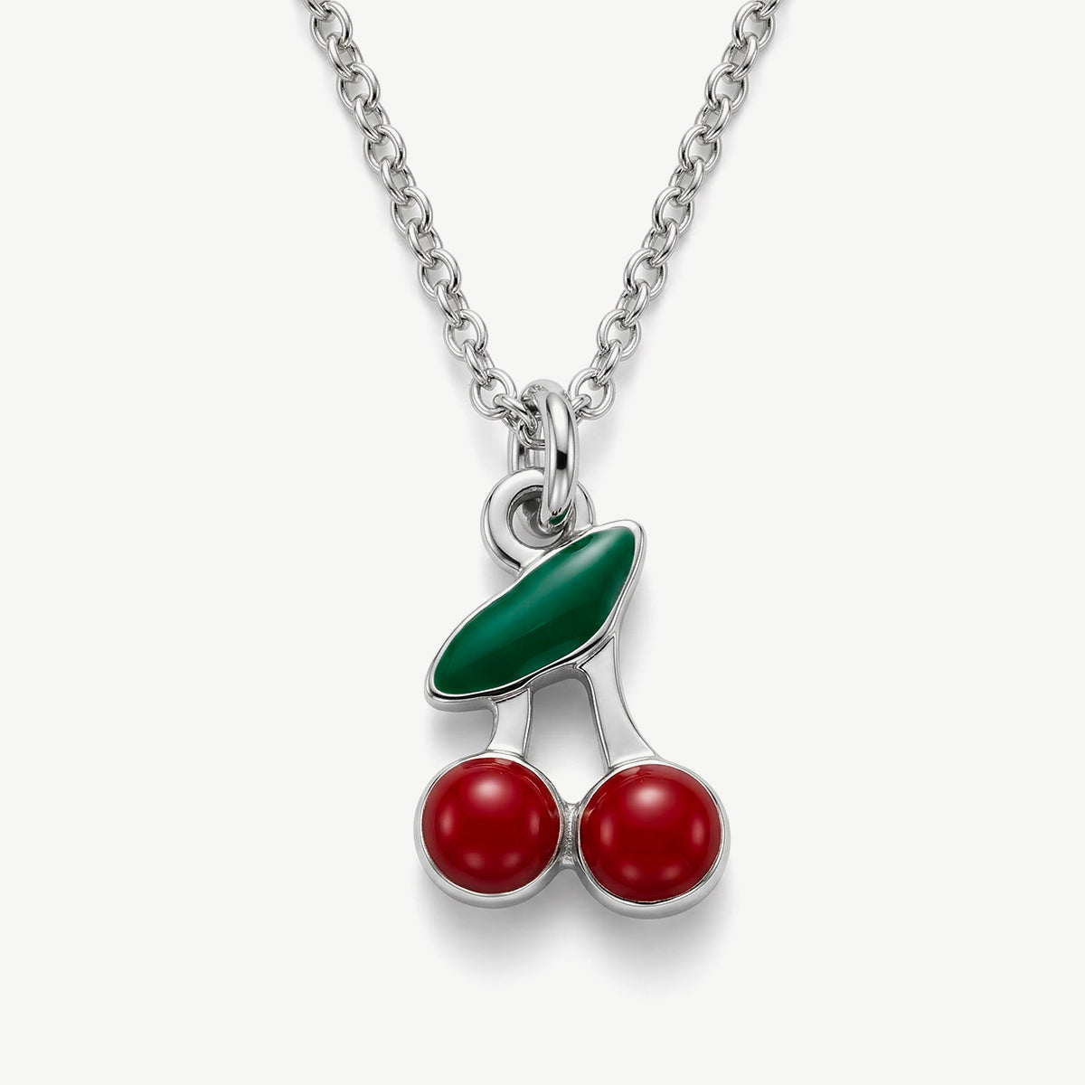 Il pendente raffigura delle graziose ciliegie smaltate rosse con foglia verde, un dettaglio colorato e raffinato che dona al gioiello un look allegro e distintivo. Lo smalto lucido esalta i colori rendendo il ciondolo brillante e perfetto per essere indossato sia con outfit casual sia con look più eleganti.