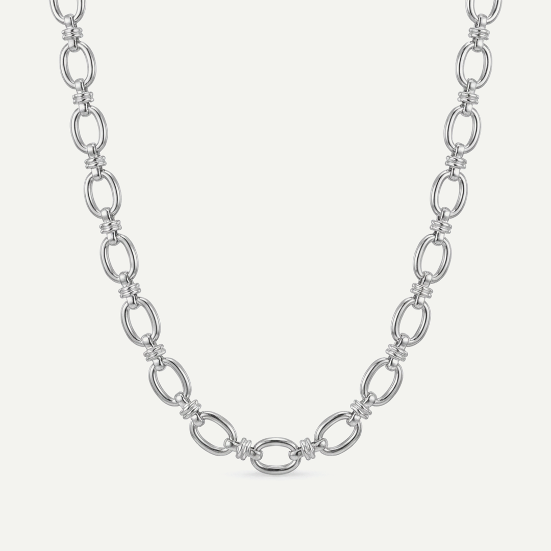 Le maglie, impreziosite da piccoli dettagli avvolgenti, creano un ritmo armonioso e dinamico che valorizza l’intera collana. Una creazione dal forte impatto visivo, perfetta da indossare come elemento principale del proprio outfit o abbinata ad altri gioielli per un layering più elaborato.
