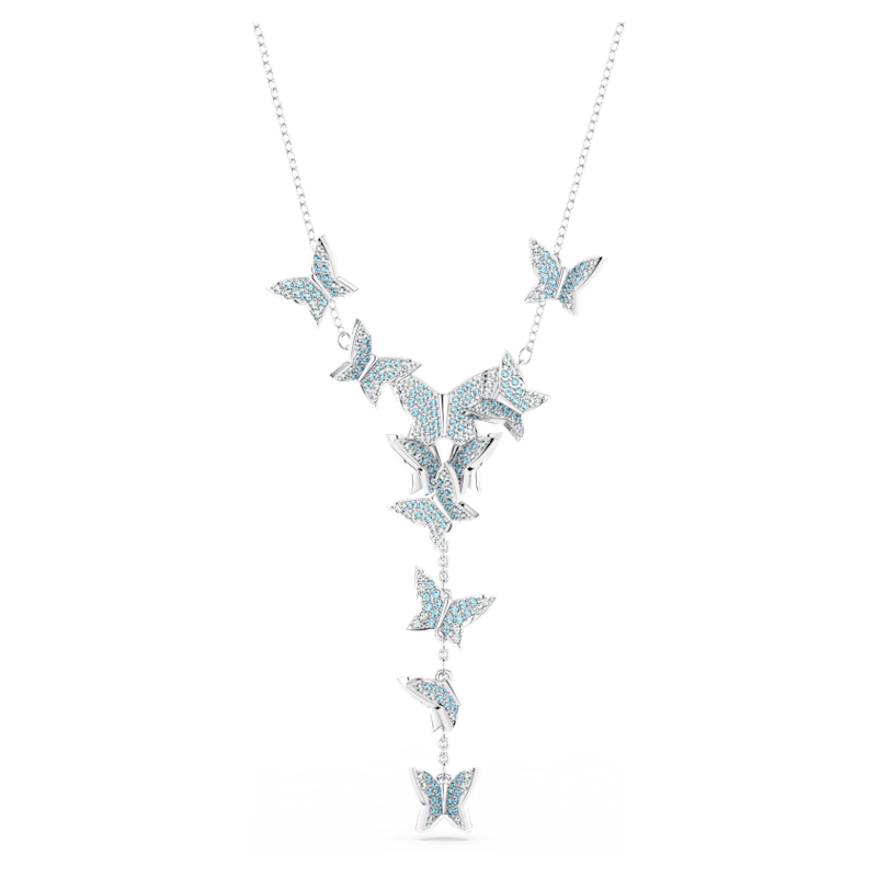 Aggiungi un tocco di frizzante bellezza al tuo guardaroba con questa delicata collana a forma di Y. Placcata rodio, il suo design presenta piccole farfalle impreziosite da uno scintillante pavé di cristalli blu. Indossa questo ecclettico gioiello con i tuoi outfit casual da giorno, o anche per valorizzare i tuoi look più eleganti.