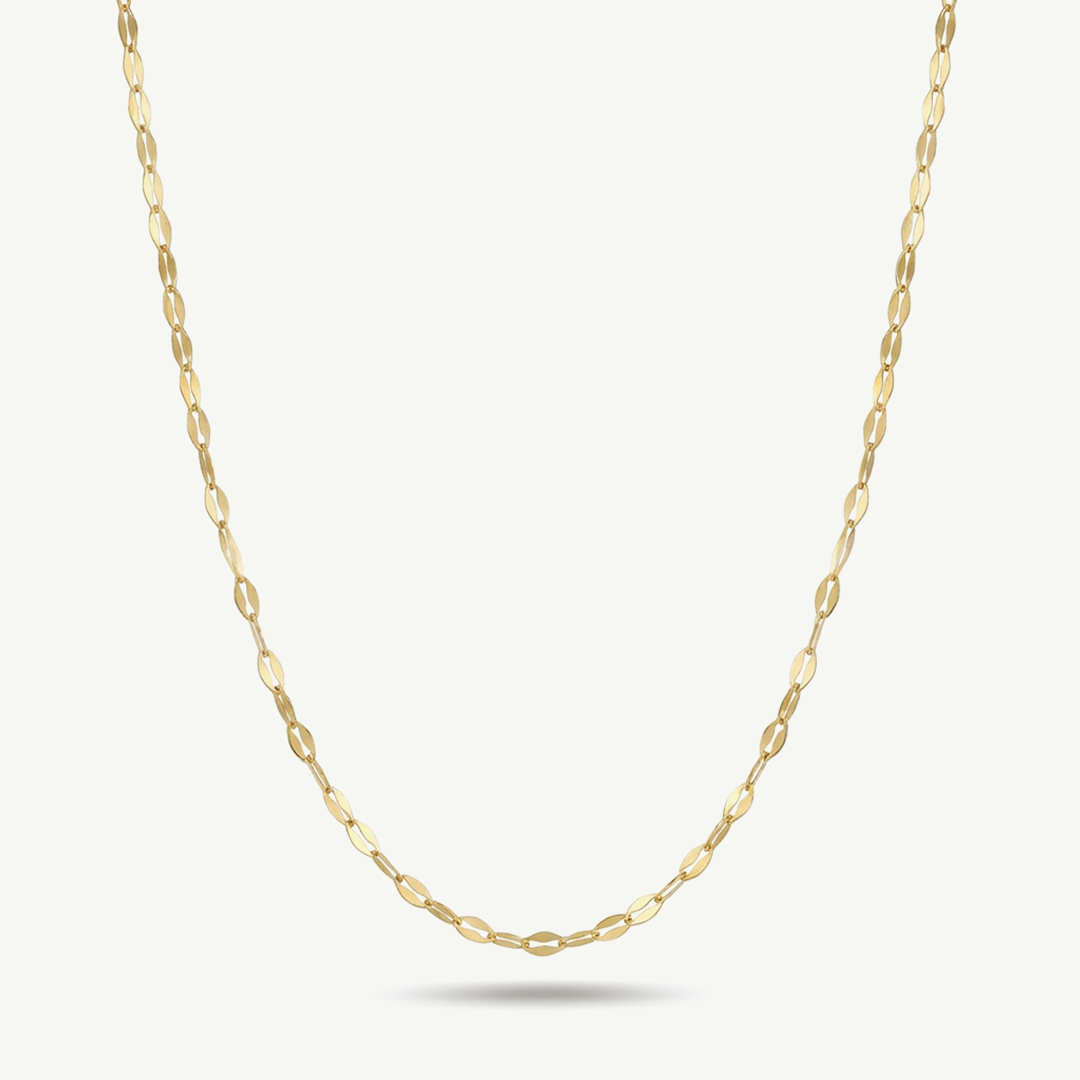 La collana Fabiani lametta è realizzata in oro giallo 9kt ed è proposta nella lunghezza 45 cm, una misura classica e versatile che si adagia elegantemente sul décolleté. La catena sottile e luminosa, caratterizzata da maglie schiacciate, riflette la luce con continuità grazie alla finitura liscia e lucida.