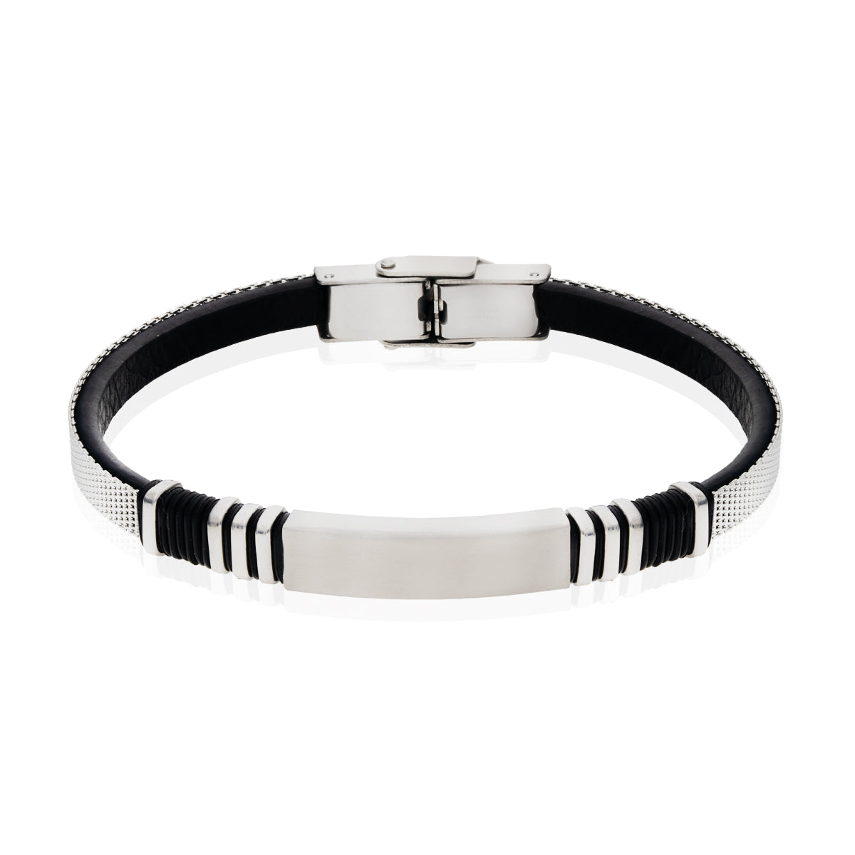 Bracciale in acciaio, pelle e caucciù. Chiusura a scatto. Misura 22,5 cm circa.
