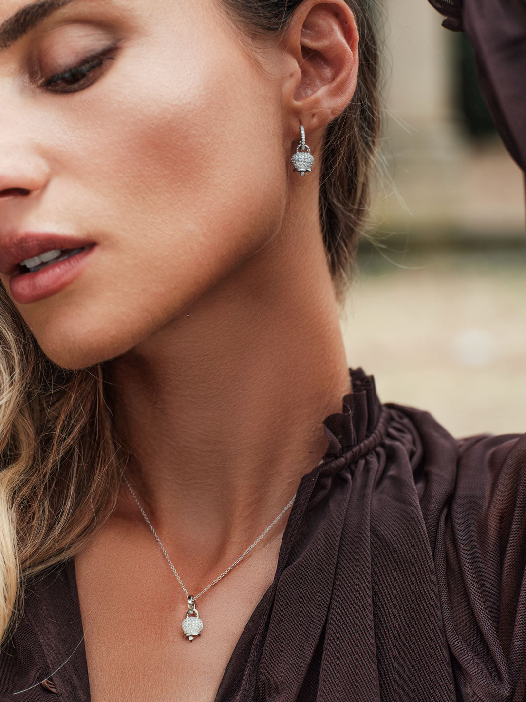 Eleganti e luminosi, questi orecchini a cerchio in argento rodiato presentano un charm a campanello ricoperto da pavé di zirconi bianchi. Il design sofisticato unisce la brillantezza dei dettagli con una forma moderna e raffinata, perfetta per impreziosire ogni look.