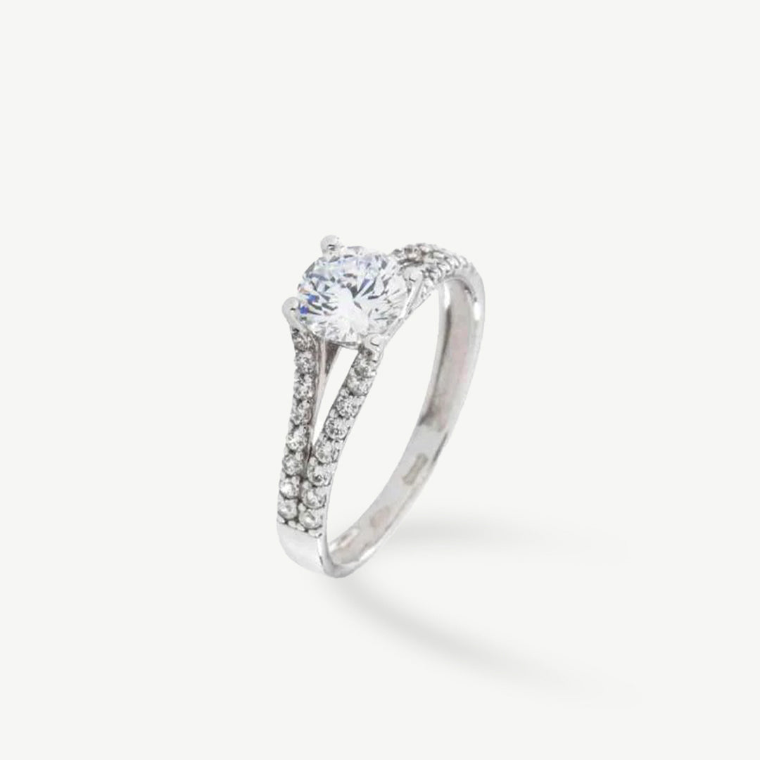 Al centro dell’anello spicca uno zircone taglio brillante, affiancato da zirconi laterali che aggiungono profondità e scintillio. La montatura in oro bianco 9Kt dona un tocco moderno e resistente, garantendo comfort e una lucentezza impeccabile nel tempo.