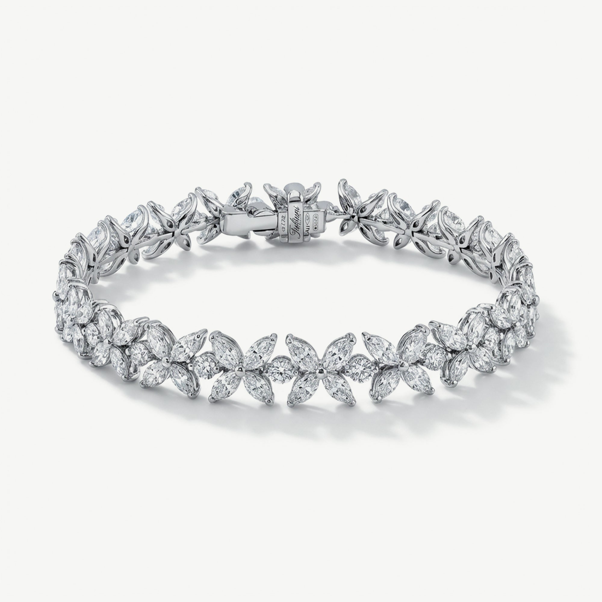 Realizzato con una sequenza di diamanti naturali taglio navette, il bracciale disegna un raffinato motivo floreale continuo, leggero e sofisticato. Le gemme, per una caratura totale di 7,22 carati, sono selezionate con purezza VVS e colore F–G, garantendo una brillantezza eccezionale, cristallina e uniforme.