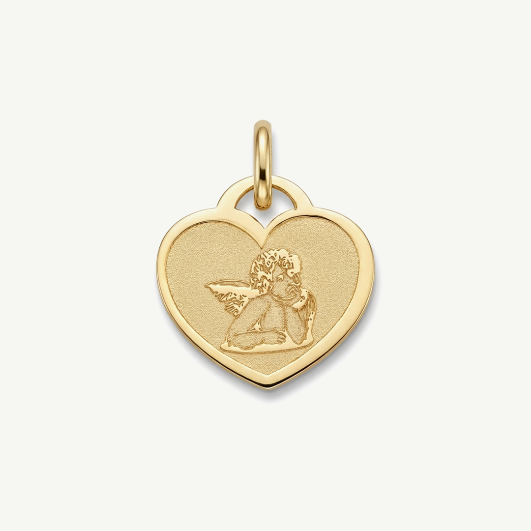 La medaglia Fabiani a cuore è realizzata in oro giallo 18kt e raffigura un delicato angelo inciso, simbolo di protezione, amore e spiritualità. La lavorazione satinata del fondo crea un elegante contrasto con il profilo lucido, esaltando i dettagli dell’incisione e donando profondità al design.