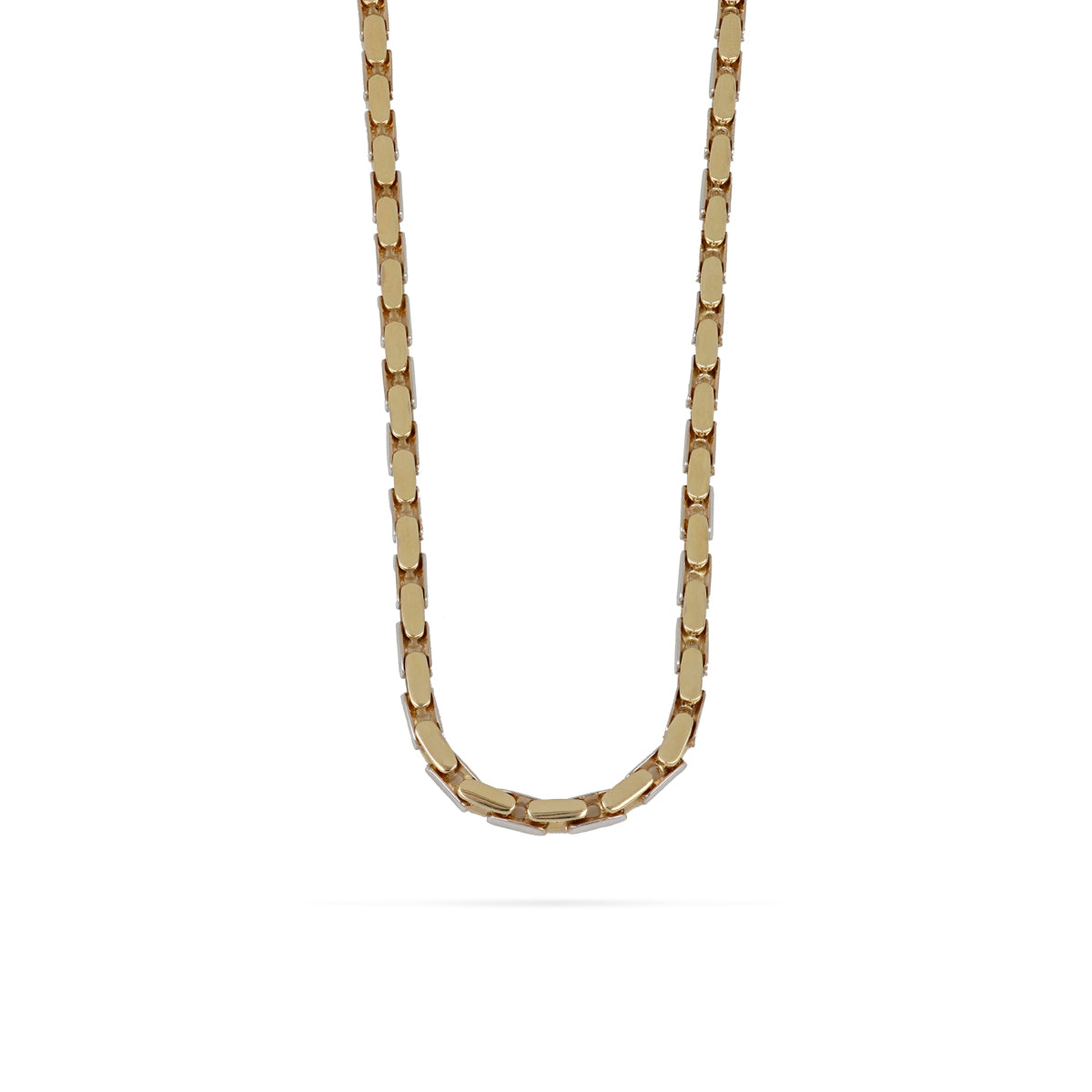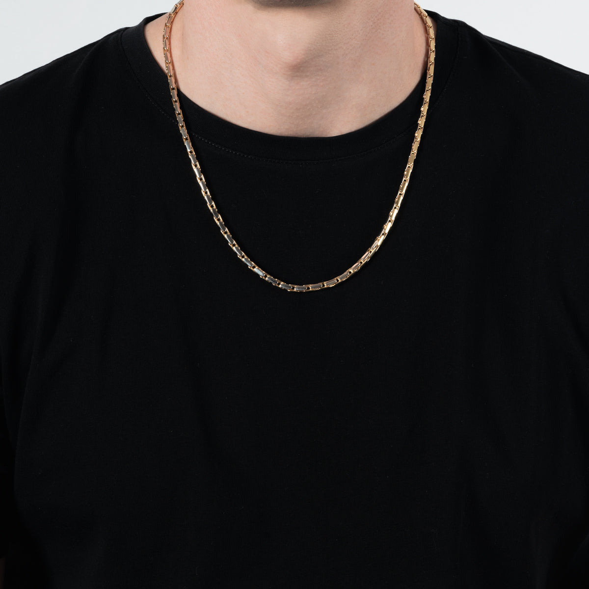 Collana a maglia cardano in oro giallo e bianco 14Kt. Lunghezza 55 cm circa e chiusura a moschettone.