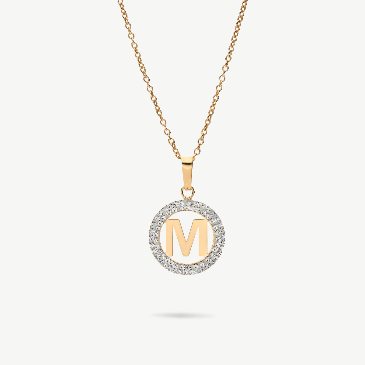 Il ciondolo con iniziale M, incastonato in un cerchio di zirconi bianchi crystal white, dona luce e raffinatezza a ogni look.