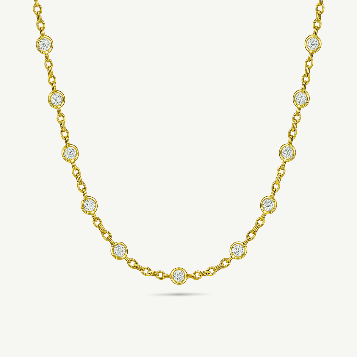 La collana Fabiani in argento 925 dorato unisce luminosità e raffinatezza grazie ai suoi zirconi taglio brillante incastonati lungo la catenina a maglia rolò. Il design essenziale ma elegante la rende un gioiello versatile, perfetto per aggiungere un tocco di luce a qualsiasi look.