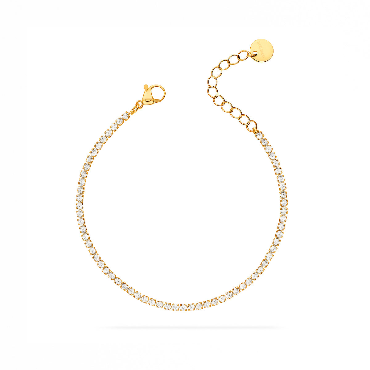 Il bracciale Meridien Jewels tennis in acciaio dorato da 20 cm è impreziosito da una raffinata fila di zirconi bianchi da 2,04 mm, incastonati con precisione per esaltare la luminosità del metallo e la brillantezza delle pietre.