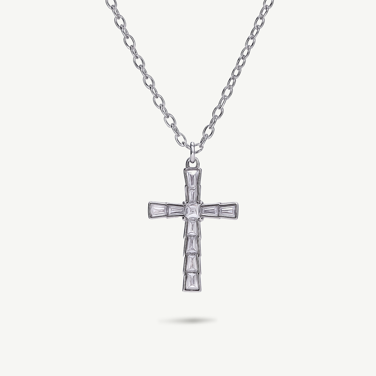 La croce, impreziosita da zirconi taglio baguette, cattura la luce con raffinatezza, creando un effetto scintillante e sofisticato.