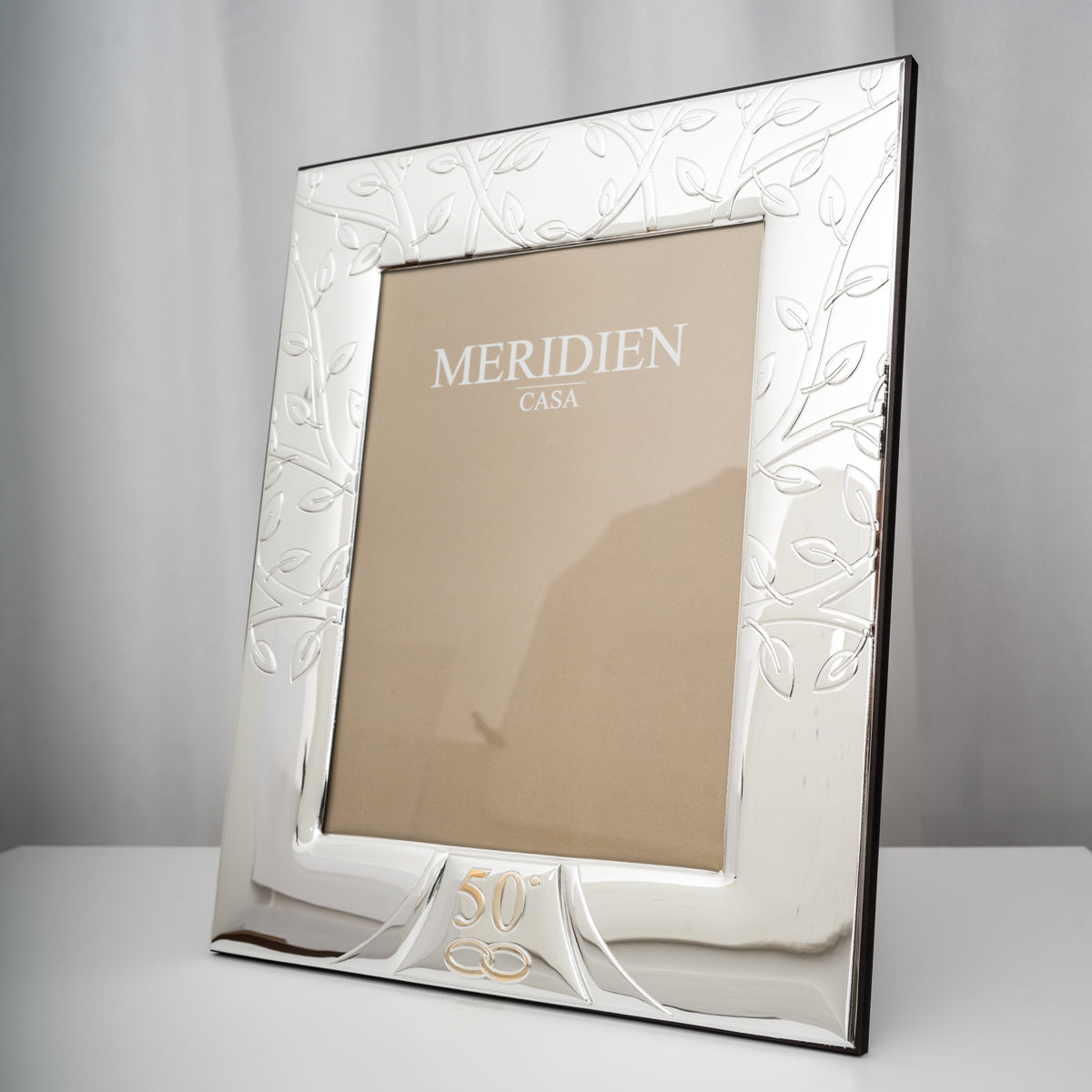 Celebra un traguardo speciale con la cornice portafoto 50° anniversario Meridien. Realizzata in finitura argentata con eleganti decorazioni a rami e foglie, racchiude nel suo design un simbolo di amore, unione e durata nel tempo.