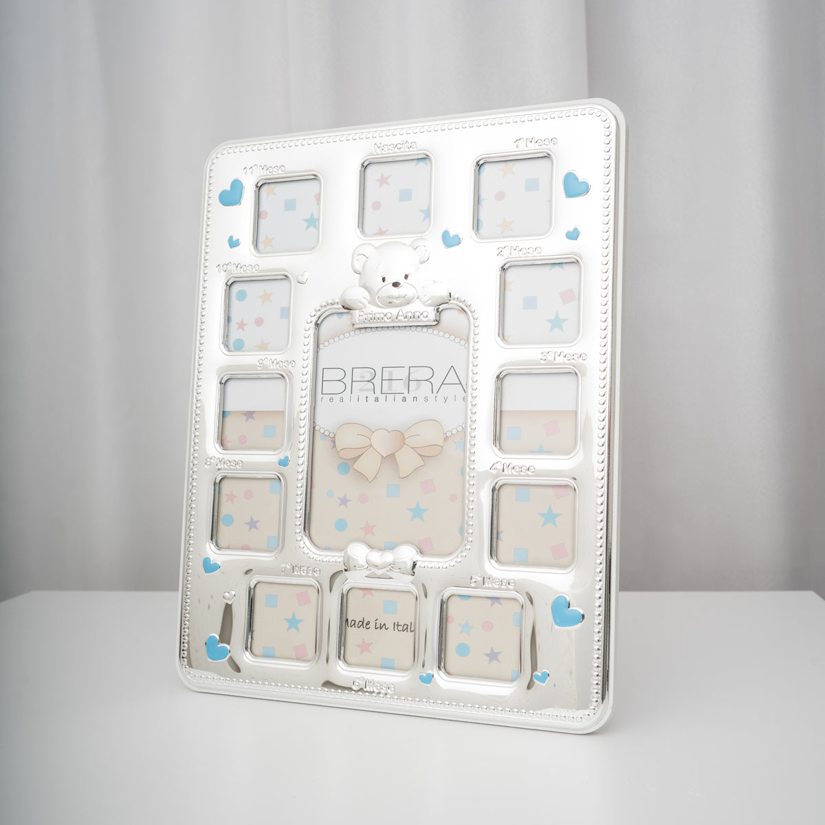 Realizzata in finitura argentata lucida, presenta un dolce orsetto centrale e dodici riquadri dedicati ai mesi di crescita, da Nascita fino ai 12 mesi. I dettagli azzurri e i piccoli cuoricini smaltati donano un tocco di tenerezza ed eleganza.
