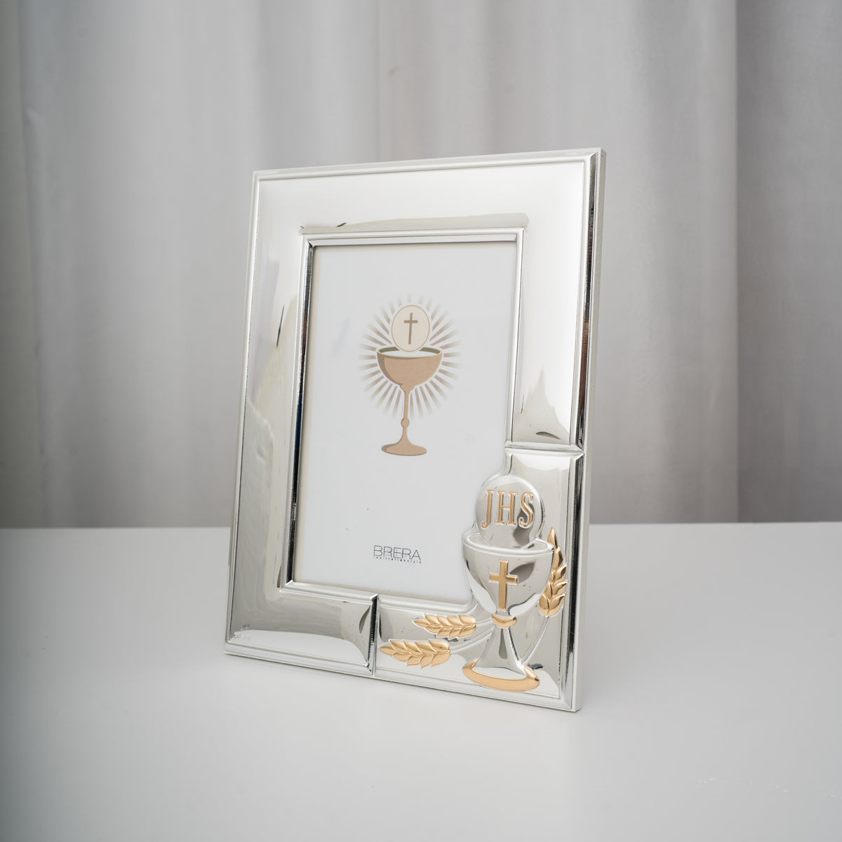 La cornice portafoto 10x15 Meridien dedicata alla Prima Comunione è un raffinato oggetto simbolico e decorativo. Il profilo argentato lucido, arricchito da dettagli dorati, raffigura il calice e l’ostia con la sigla “JHS”, insieme a spighe di grano, simboli di fede e spiritualità.
