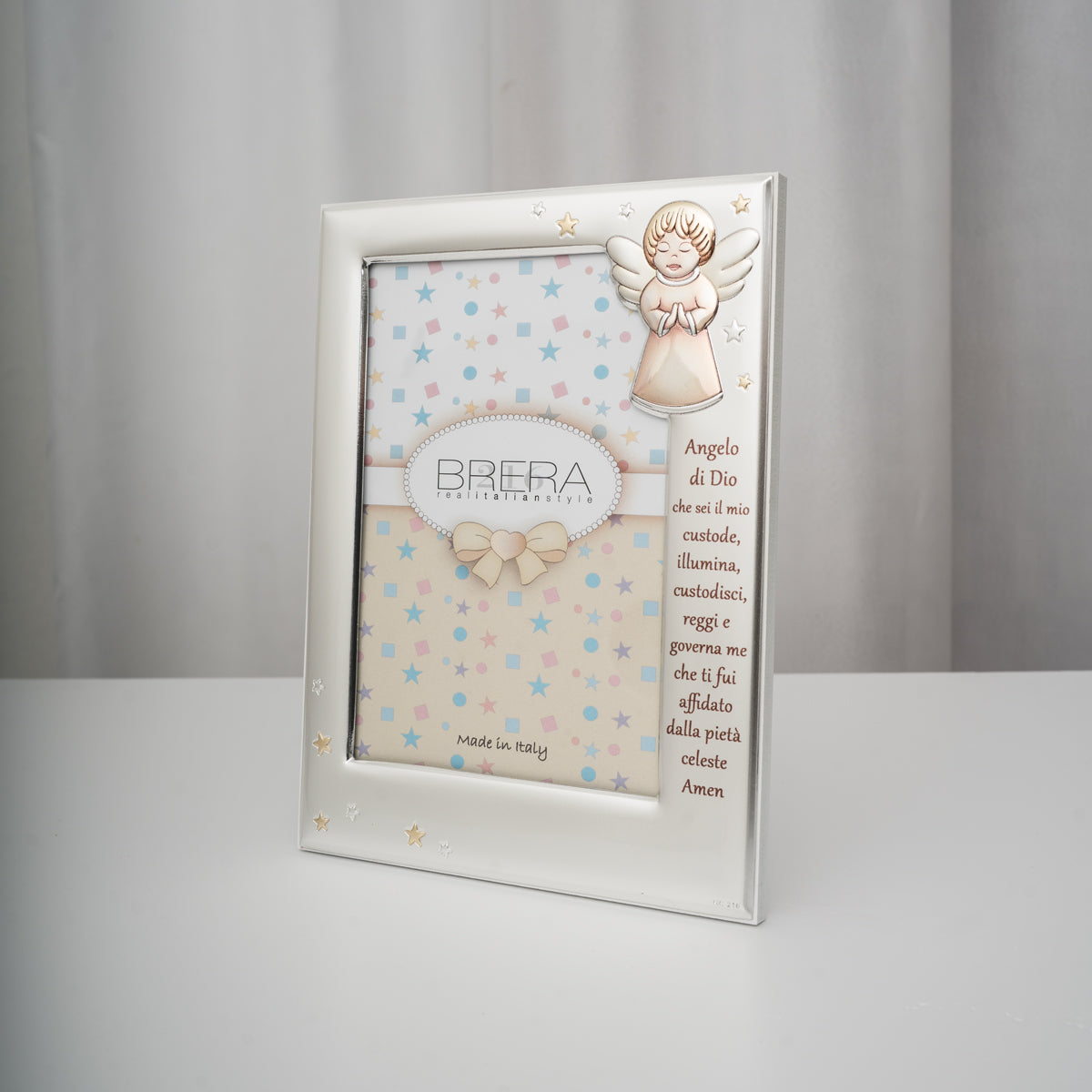 La cornice portafoto 13x18 Meridien con dolce decorazione a forma di angelo è un raffinato complemento d’arredo pensato per custodire i ricordi più teneri dell’infanzia. Il profilo argentato lucido è impreziosito da stelline incise e dalla preghiera dell’“Angelo di Dio”, mentre il piccolo angelo smaltato con delicati dettagli dorati aggiunge un tocco di dolcezza e spiritualità.