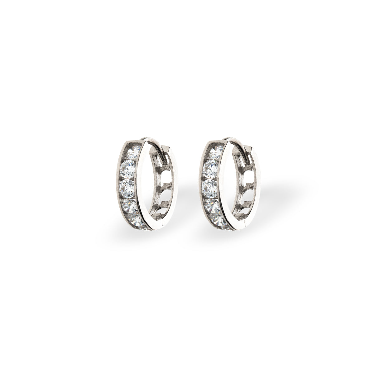 Raffinati e luminosi, gli orecchini a cerchio in oro bianco 9KT Fabiani sono impreziositi da una fila di zirconi taglio brillante che esaltano la luce e la brillantezza del metallo prezioso.