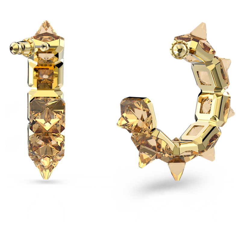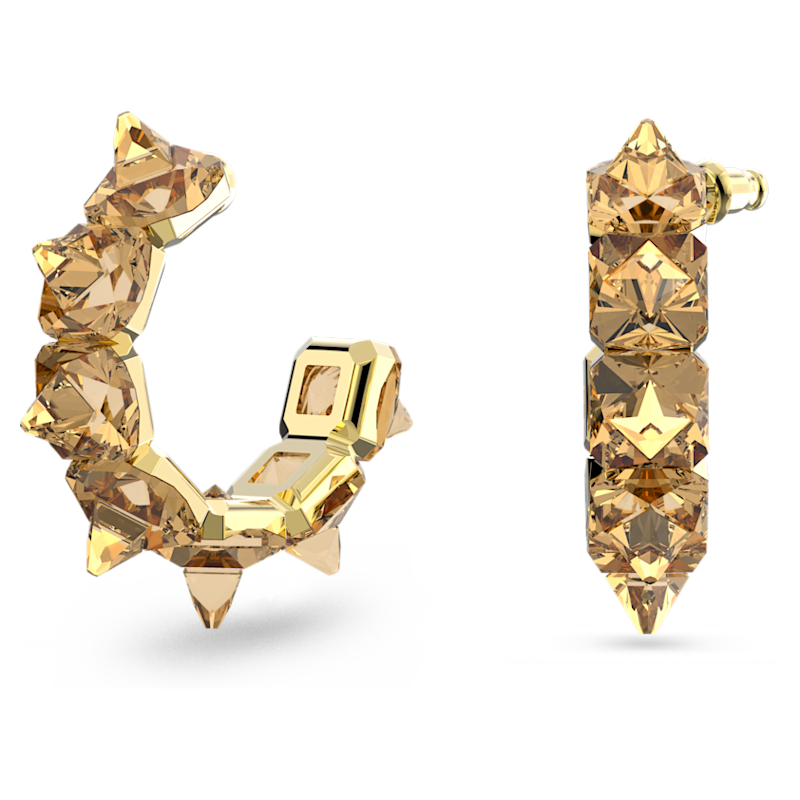 Lavorati con raffinati cristalli dal taglio piramidalein una profonda tonalità dorata, su complementari montature placcate color oro, semi-circolari, questi orecchini a metà cerchio si ispirano all’opera dell’artista Emma Kunz. Uno stile geometrico moderno indossabile da solo o a strati con altri gioielli della linea Chroma. Parte della linea Chroma, questi orecchini sono firmati dalla Direttrice creativa Giovanna Engelbert per la Collection II.