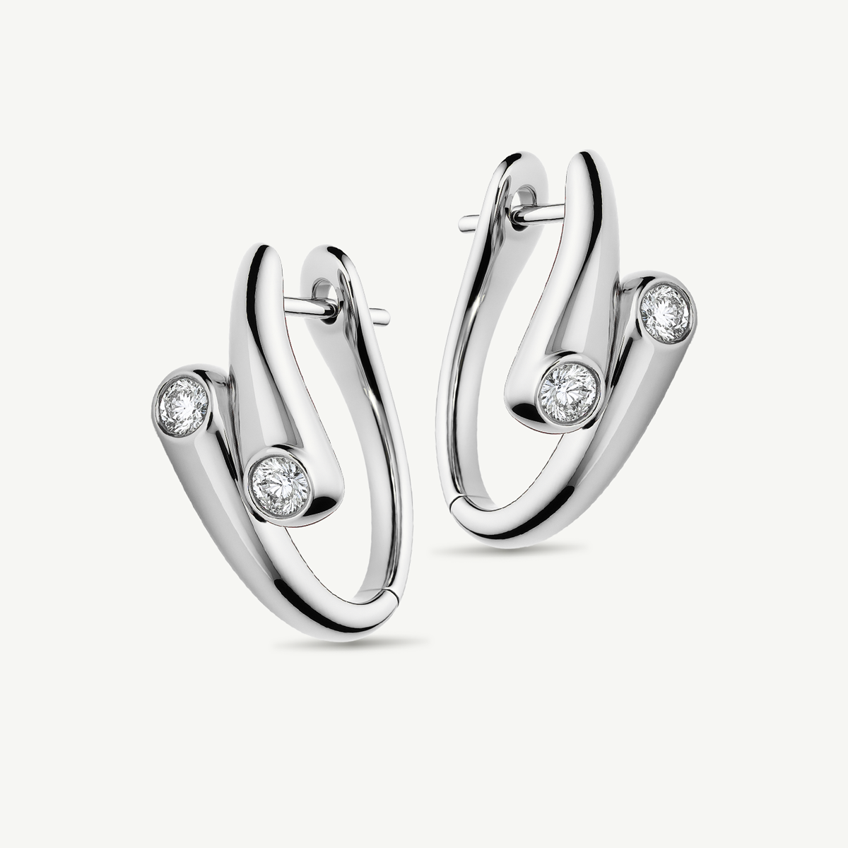 Realizzati in oro giallo 18Kt, presentano due diamanti taglio brillante per una caratura complessiva di 0,28ct, incastonati con maestria alle estremità delle forme morbide e fluide che caratterizzano la collezione Bubble.