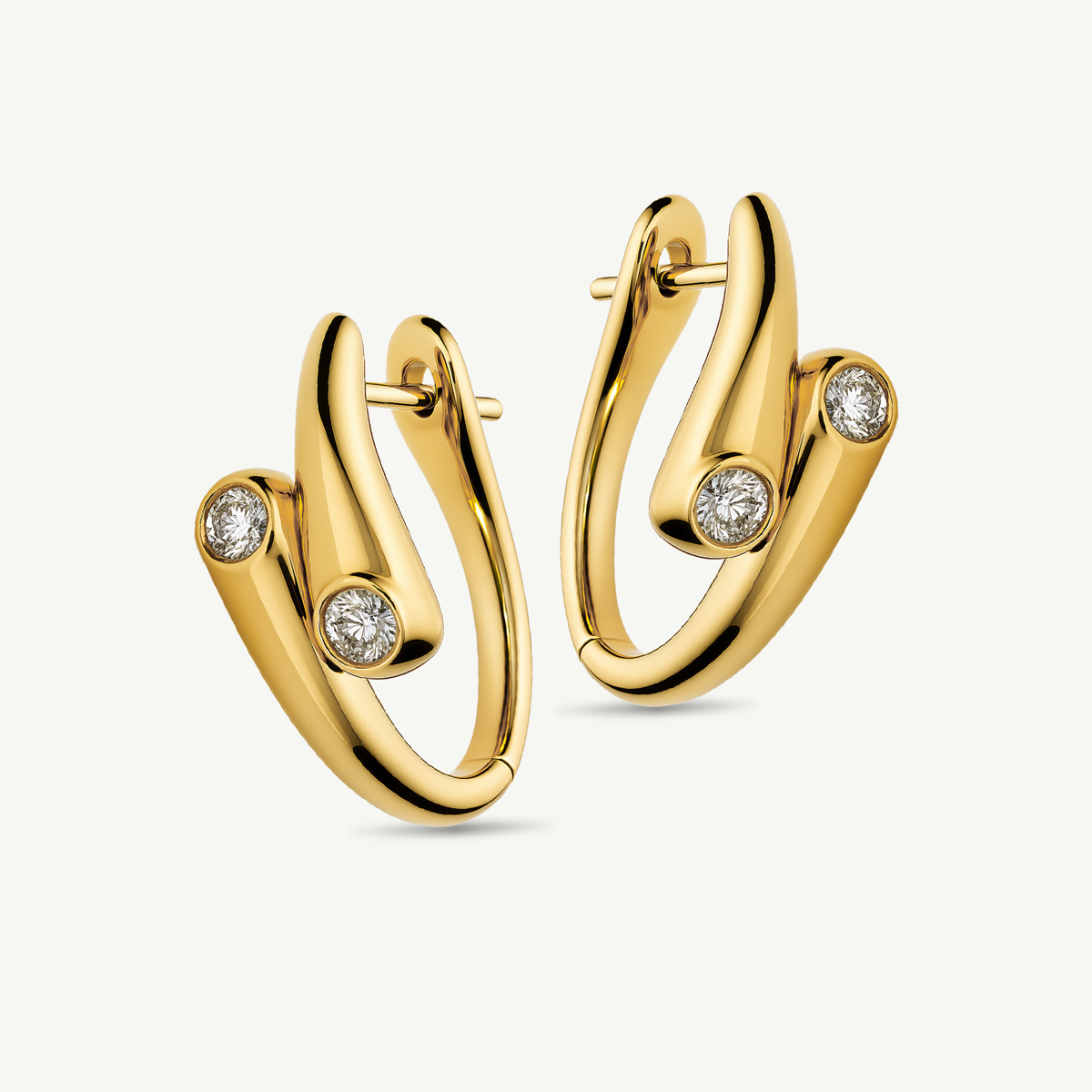Realizzati in oro giallo 18Kt, presentano due diamanti taglio brillante per una caratura complessiva di 0,28ct, incastonati con maestria alle estremità delle forme morbide e fluide che caratterizzano la collezione Bubble.