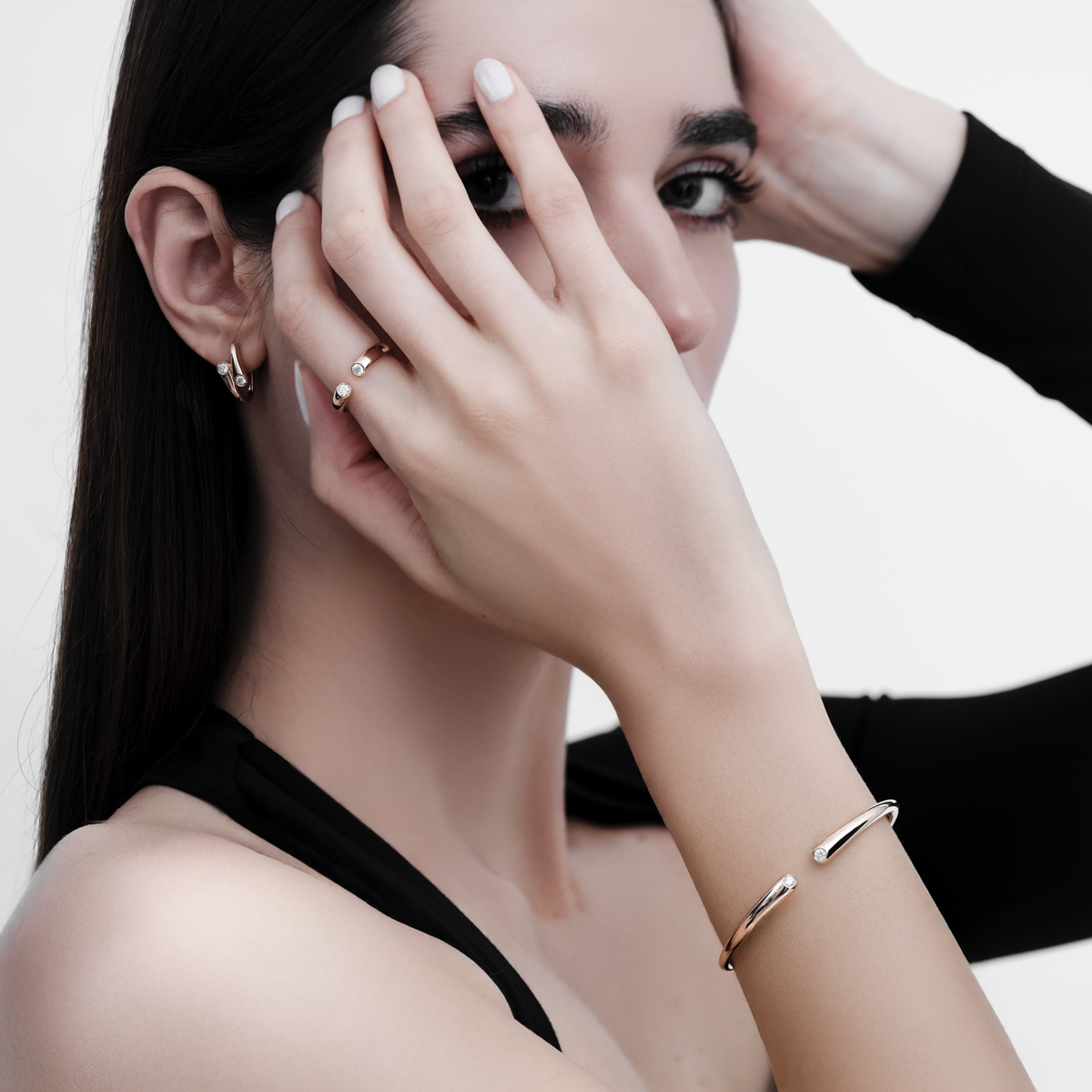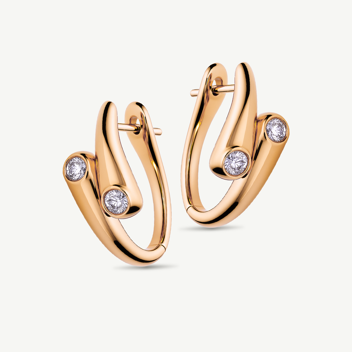 Realizzati in oro rosa 18Kt, presentano due diamanti taglio brillante per una caratura complessiva di 0,28ct, incastonati con maestria alle estremità delle forme morbide e fluide che caratterizzano la collezione Bubble.