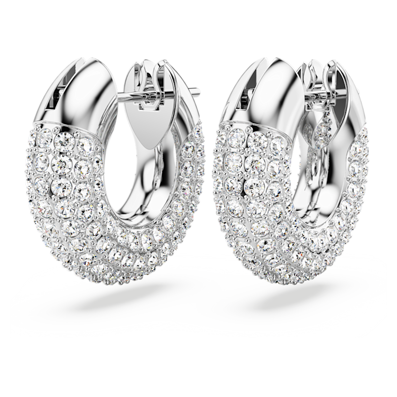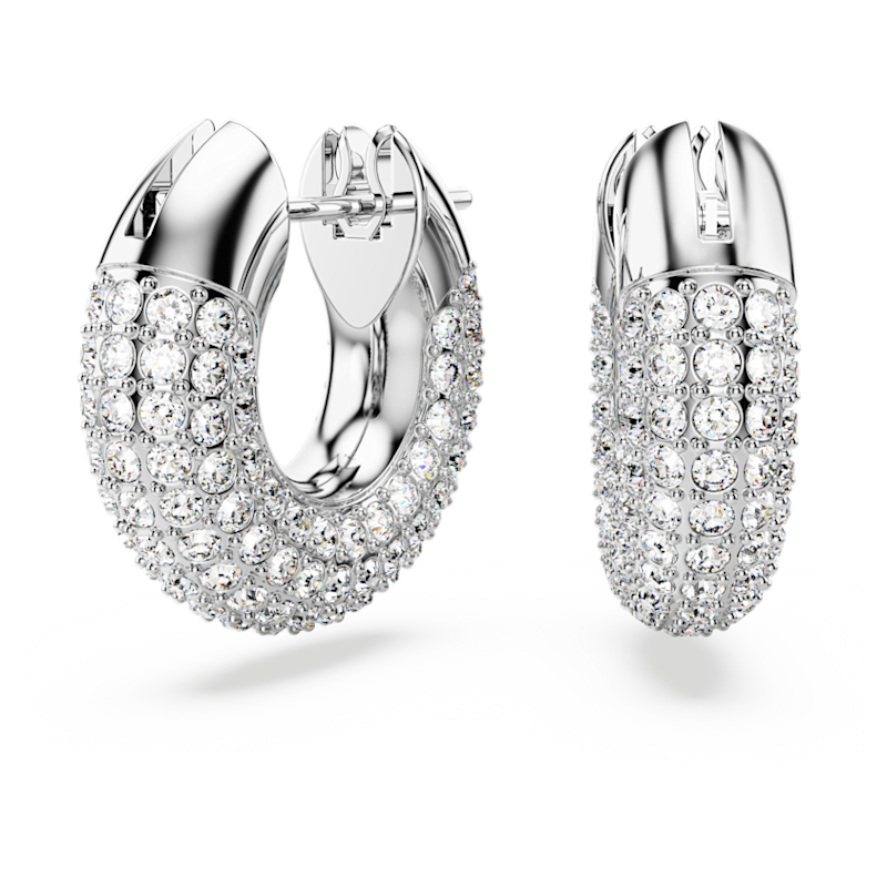 Un tocco moderno ai classici orecchini a cerchio, questo paio genderless conferirà dinamismo a qualsiasi outfit. Il design scultoreo celebra l’iconica tecnica pavé di Swarovski con cristalli luccicanti laminati incastonati in una montatura placcata rodio. Questo duo è adatto di giorno ma perfetto anche per la sera. Parte della famiglia Dextera, questi orecchini sono ideati dalla Direttrice Creativa Giovanna Engelbert per la Collection II.