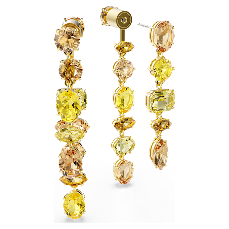 Questi espressivi orecchini a buco sono pensati per infondere energia e buonumore. Ciascun orecchino placcato in tonalità oro presenta due fili asimmetrici, impreziositi da un mix di cristalli con montatura a griffe in vari tagli e tonalità gialle e ambra. Emblematici delle inaspettate formazioni e della vivace bellezza di Gema, risplendono ancora di più se indossati insieme ad altri gioielli coordinati della stessa famiglia.