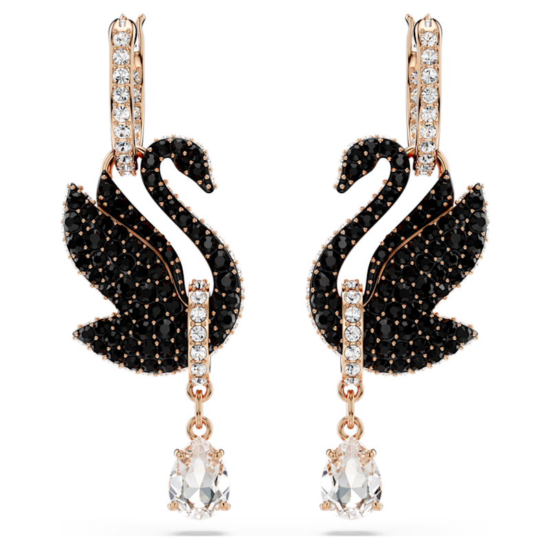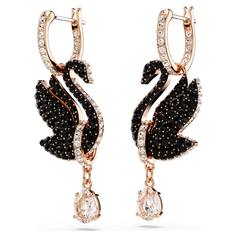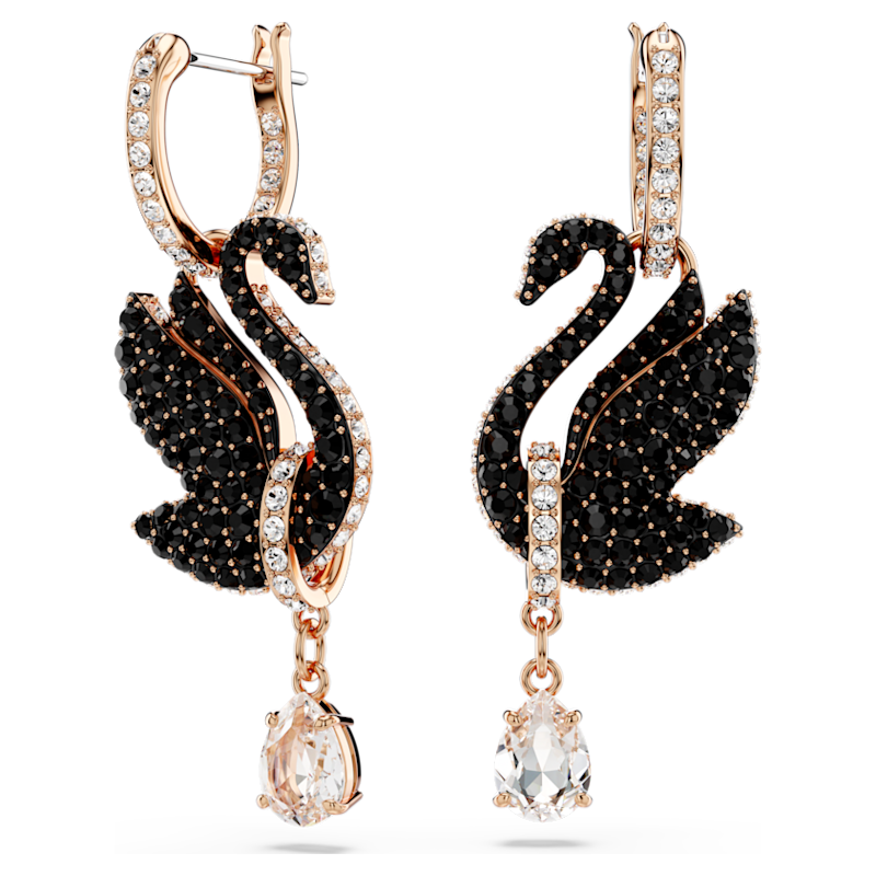 Orecchini pendenti Swan, Cigno, Neri, Placcato color oro rosa