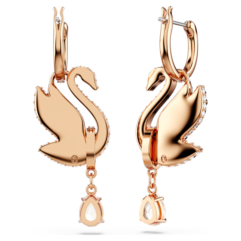 Questi orecchini che catturano ogni raggio di luce sono una splendida interpretazione dell’iconico emblema Swarovski. Collegato a mini cerchi, ciascun orecchino, placcato color oro rosa, presenta un elegante motivo con cigno, magistralmente decorato con un pavé di Swarovski ReCreated™ crystals Jet Black. Uno Swarovski Zirconia trasparente dal taglio Pear è delicatamente sospeso ad una maglia color oro rosa. Indossa questi orecchini per elevare il tuo stile personale, oppure presentali come radioso regalo a una persona che ami.