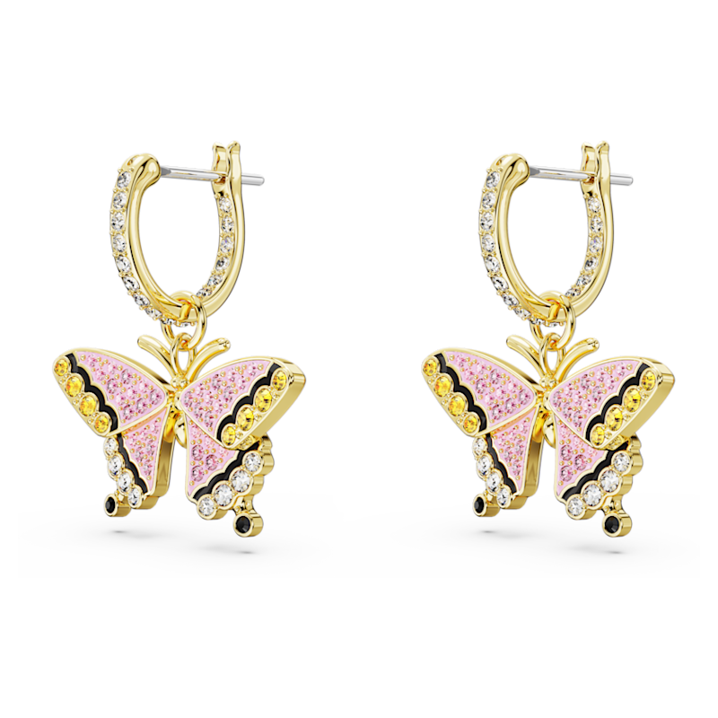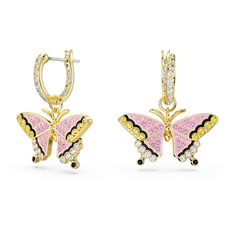 Questi bellissimi orecchini della famiglia Idyllia raffigurano una splendente farfalla in volo. Incastonate in una placcatura color oro, le sue delicate ali sono realizzate con cristalli rosa, bianchi, neri e gialli e pendono da un mini orecchino a cerchio ricoperto di cristalli. Aggiungi un magico sprazzo di colore a una maglietta bianca, al denim o a un look da sera: questi gioielli saranno sempre perfetti.