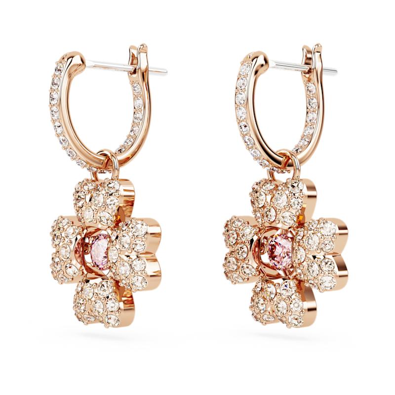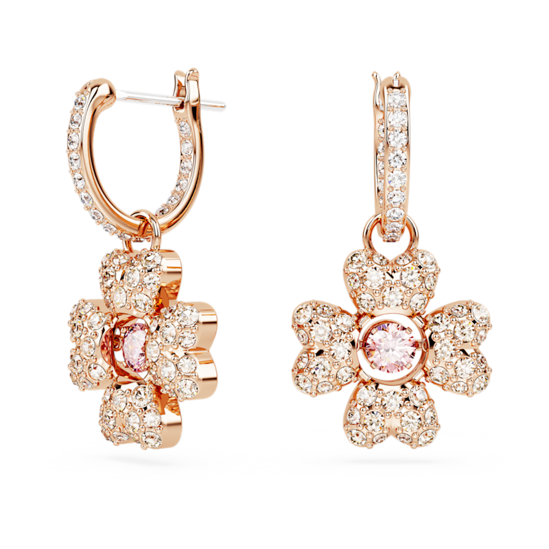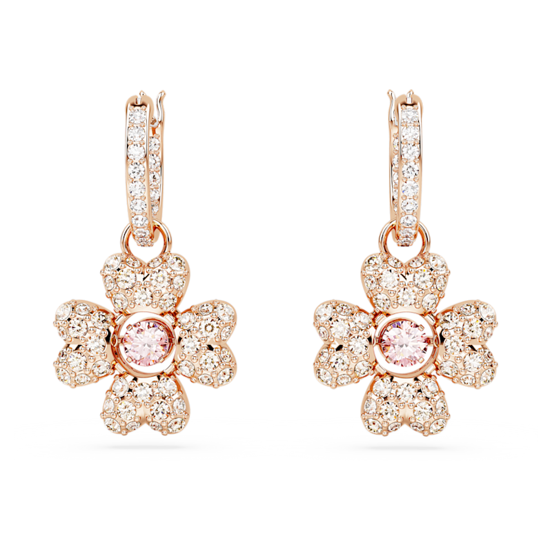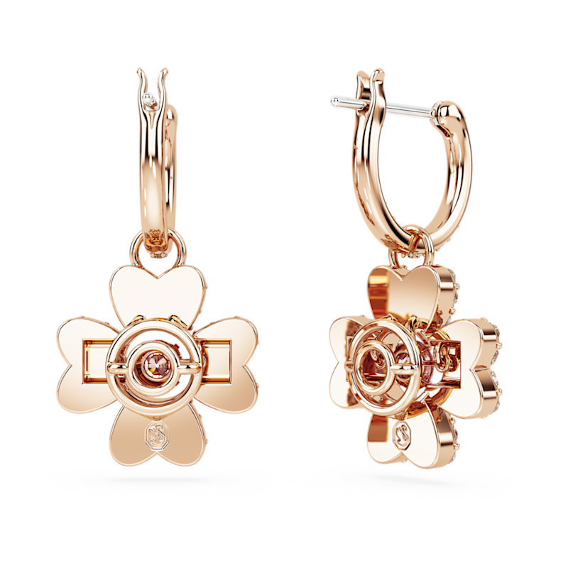 La natura incontra la fantasia in questi affascinanti orecchini della collezione Idyllia. Il design placcato color oro rosa di ciascun mini orecchino a cerchio presenta un motivo portafortuna a quadrifoglio, realizzato con uno Swarovski Zirconia centrale rosa e quattro foglie decorate da un pavé di cristalli Cry. Un modo giocoso e meraviglioso di infondere gioia al tuo look.