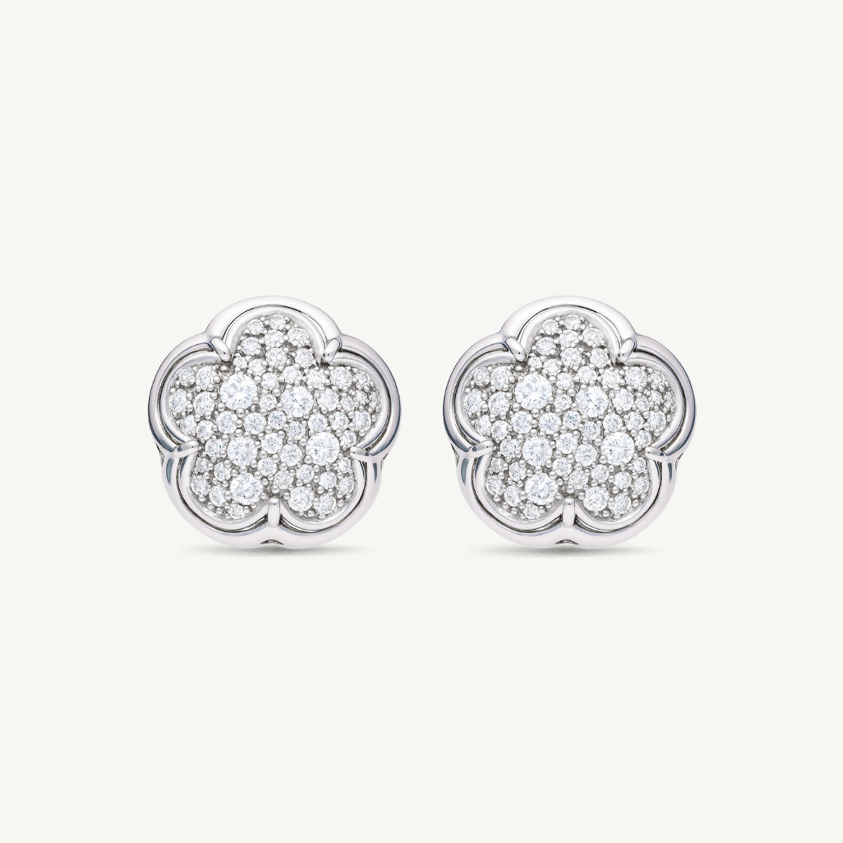 Gli Orecchini Bon Ton Pasquale Bruni incarnano l’eleganza iconica della maison, con l’inconfondibile fiore Bon Ton interamente ricoperto da un prezioso pavé di diamanti bianchi per una caratura totale di 1,06 ct. Un design raffinato, compatto e armonioso, che esprime tutta la delicatezza e la femminilità della linea.