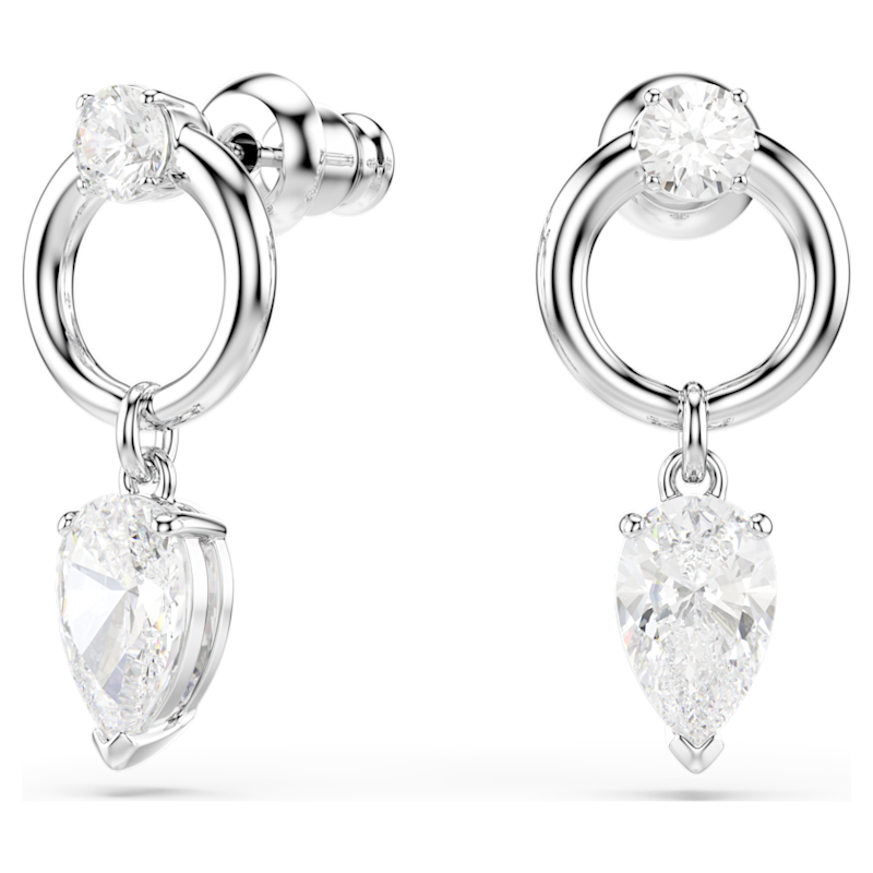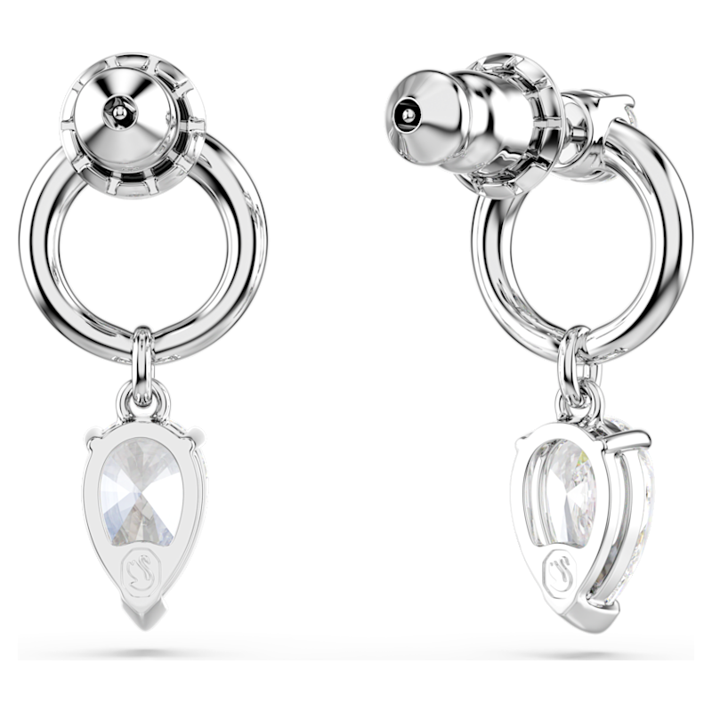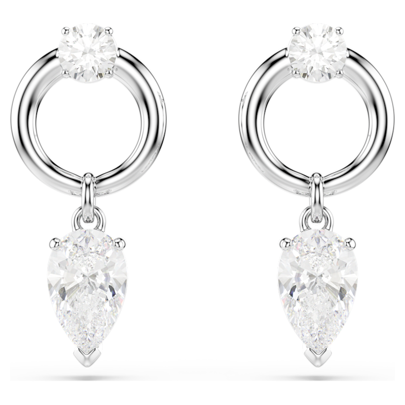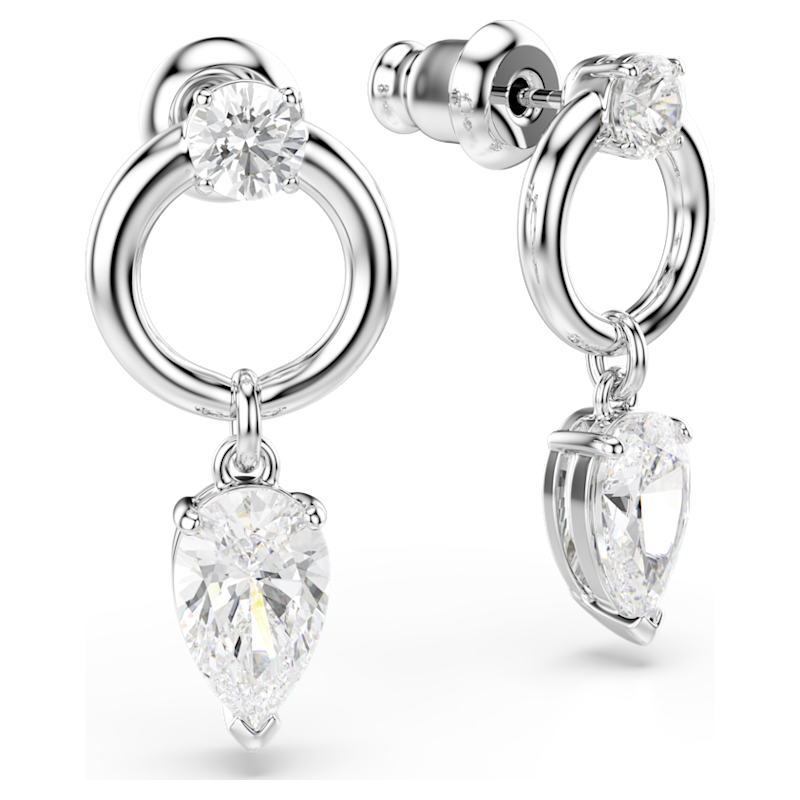 Cattura la luce da ogni angolazione con questi orecchini Mesmera unici. Ogni scintillante motivo presenta una Swarovski Zirconia taglio Pear, applicata a un lussuoso cerchio placcato rodio. Al centro è collocata anche una Swarovski Zirconia taglio Round. Indossali insieme al pendente coordinato per creare il tuo splendido set.