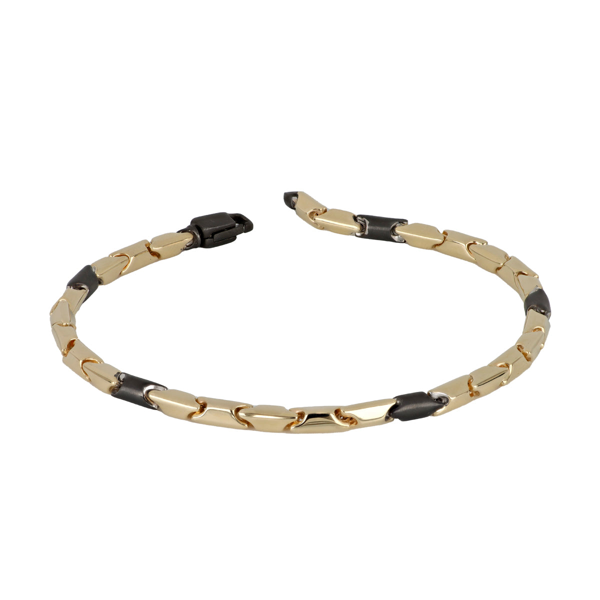 Bracciale a maglia bamboo in oro giallo 14Kt e inserti bruniti. Lunghezza 20 cm circa e chiusura a moschettone.